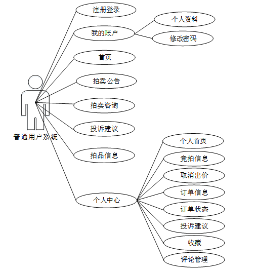 基于Java的在线拍卖系统的设计与实现中普通用户包含注册、登录、首页、拍卖公告、拍卖咨询、投诉建议、拍品信息、我的账户、个人中心等功能。普通用户用例图如下所示: