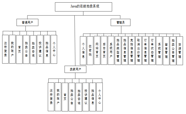 Java的在线拍卖系统包含游客(非注册用户)、 普通用户(注册用户)、卖家用户(注册用户)、管理员(注册用户)四个角色划分,每个角色对应的主要功能如下: