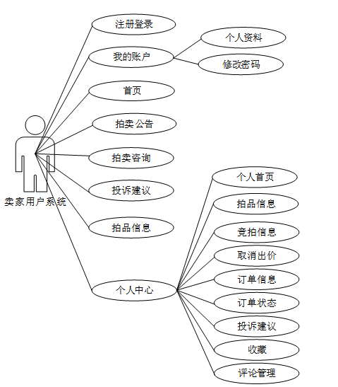基于Java的在线拍卖系统的设计与实现中卖家用户包含注册、登录、首页、拍卖公告、拍卖咨询、投诉建议、拍品信息、我的账户、个人中心等功能。中介用户用例图如下所示: