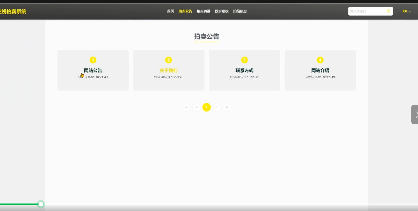 (4)拍卖公告:展示后台发布的所有拍卖公告信息,点击详情可查看具体公告内容,包括拍卖规则、注意事项等。