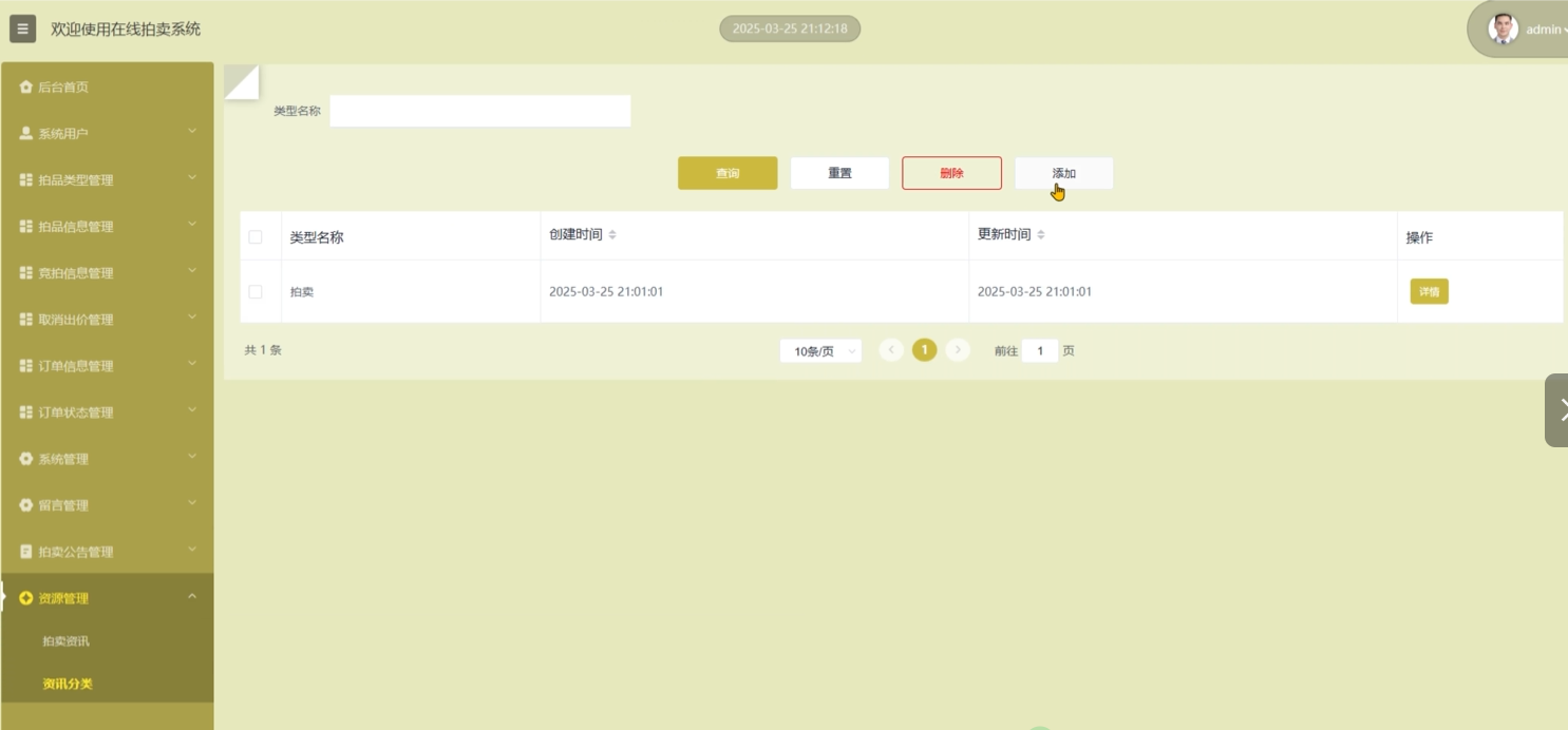 资源管理模块主要是管理员负责管理拍卖资讯的发布和分类,支持资讯编辑、分类设置和排序功能,方便管理员维护平台信息。资源管理界面如下图所示。