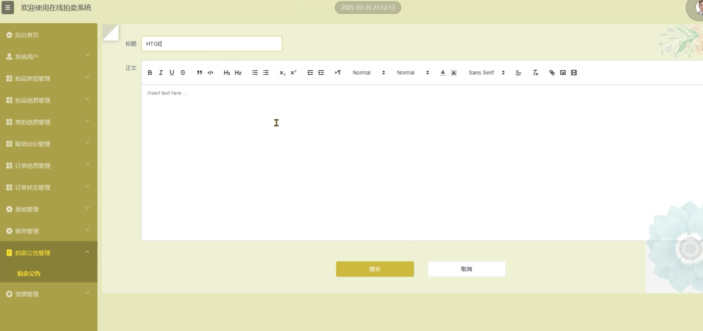 拍卖公告管理模块中管理员可创建、编辑和发布各类拍卖公告,支持公告分类、优先级设置和定时发布,重要公告可设置强制弹窗提醒,确保信息传达及时有效。拍卖公告管理界面如下图所示。