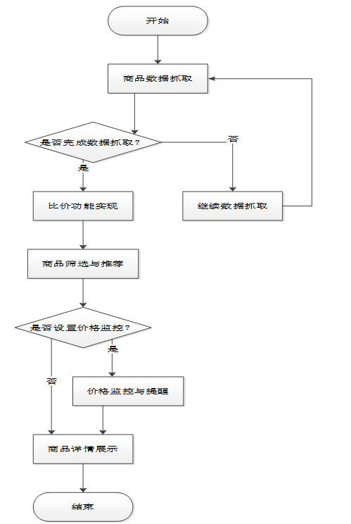 数据爬取流程从开始阶段进入商品数据抓取,系统会通过爬虫技术从多个电商平台抓取商品的实时信息。当数据抓取完成后,系统会判断是否已经完成抓取,如果完成,则进入比价功能实现阶段,展示不同平台商品的价格对比。若抓取未完成,系统将继续进行数据抓取。接下来,用户可以使用商品筛选与推荐功能,根据不同的条件筛选商品。若用户设置了价格监控,系统将进入价格监控与提醒阶段,在商品价格变化时进行提醒。最后,系统提供商品详情展示,全面展示商品的详细信息,帮助用户做出决策,流程在此结束。