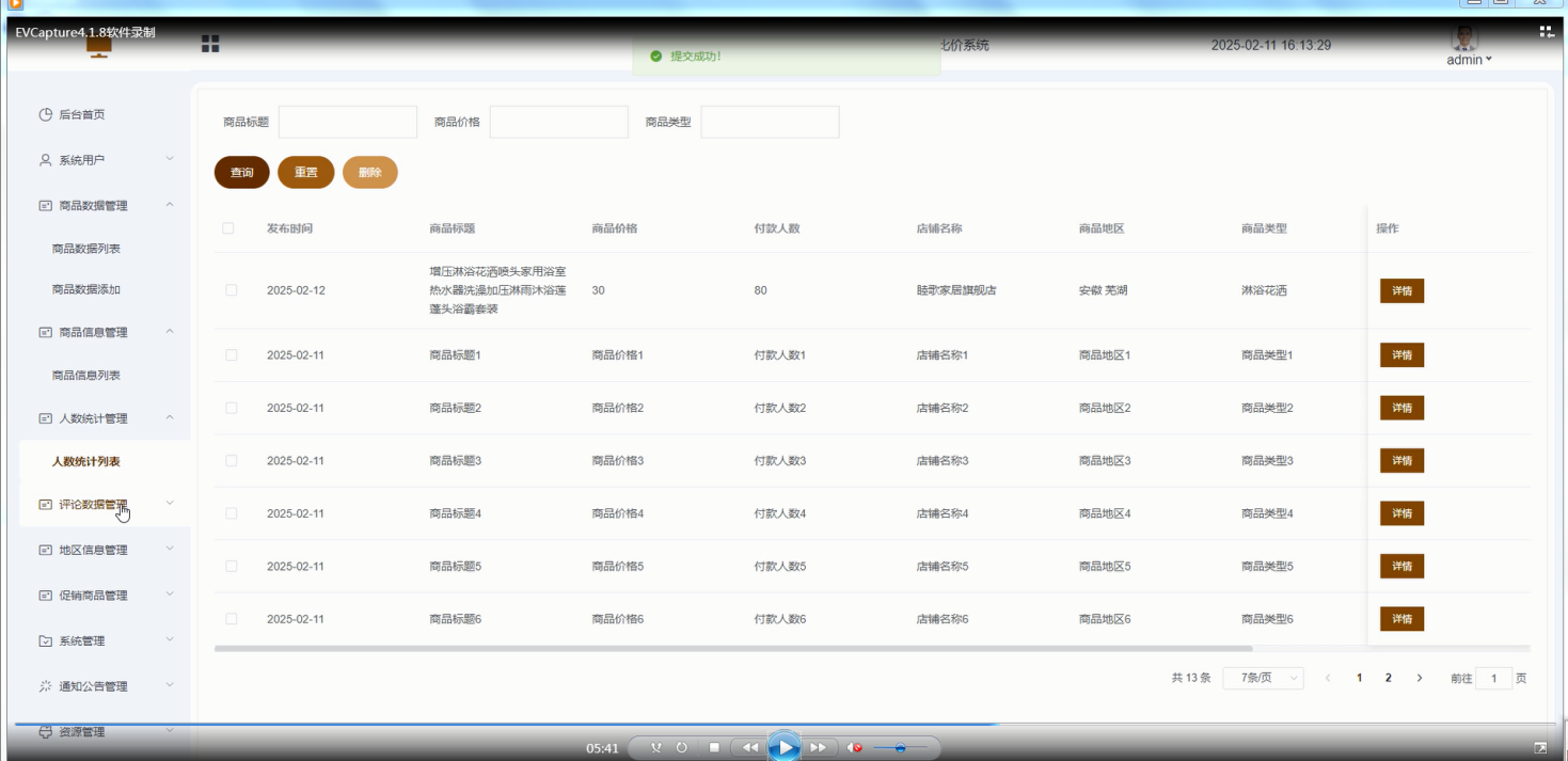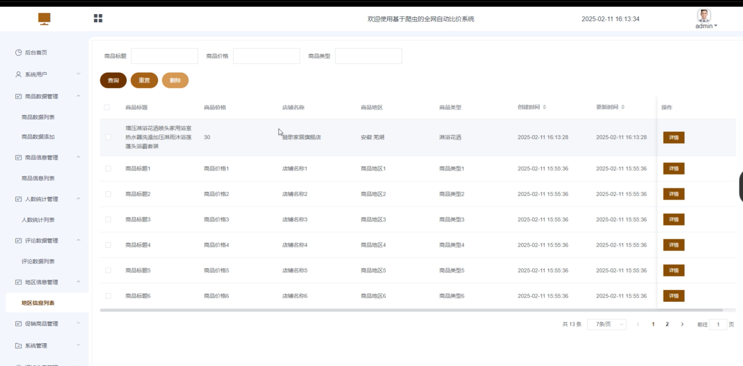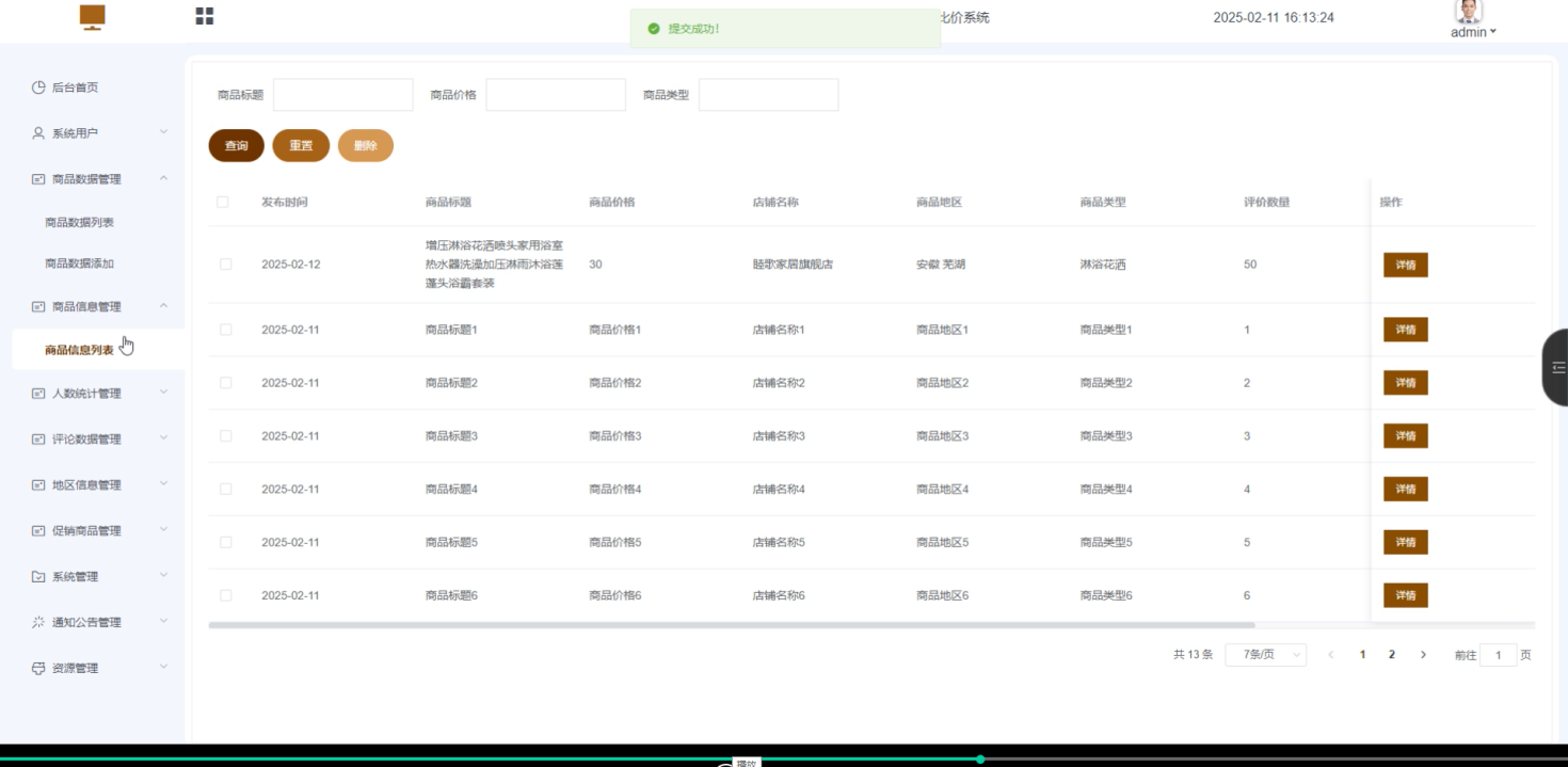 商品信息管理功能允许管理员对商品的详细信息进行全面编辑和维护,包括发布时间、商品标题、商品价格、店铺名称、商品地区、商品类型、评价数量等重要内容。管理员可以通过系统轻松地查询、重置或删除商品信息,以确保商品数据的准确性和时效性。通过数据分析技术,系统可以基于爬虫抓取的数据,自动分析商品的表现趋势,例如价格波动、销量变化、评价数量增长等。这些数据将帮助管理员深入了解商品的市场动态,从而做出更加精确的调整和决策。