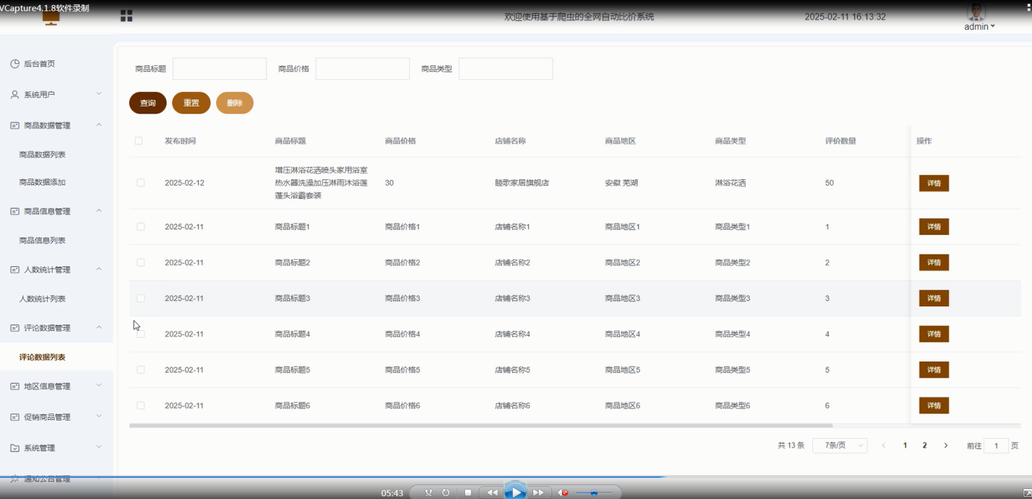 评论数据管理功能允许管理员对商品的评论信息进行全面管理,包括商品的发布时间、商品标题、商品价格、店铺名称、商品地区、商品类型以及评价数量等关键数据。通过爬虫技术,系统能够定期从各大电商平台抓取商品的评论数据,自动分析评价数量、评论内容、用户评分等信息,从而帮助管理员更好地了解每个商品的用户反馈和市场反应。爬虫技术还可以实时监控评论的变化趋势,分析哪些商品受到用户的高度评价,哪些则可能存在问题需要优化。管理员可以借助这些数据分析结果,对商品的表现进行评估,优化商品展示,并根据用户反馈调整价格、描述或促销策略,以提高商品的吸引力和销量。通过结合数据分析,评论管理功能极大地提升了商品管理的效率和精准度,帮助管理员做出更具针对性的决策。界面如下图所示。