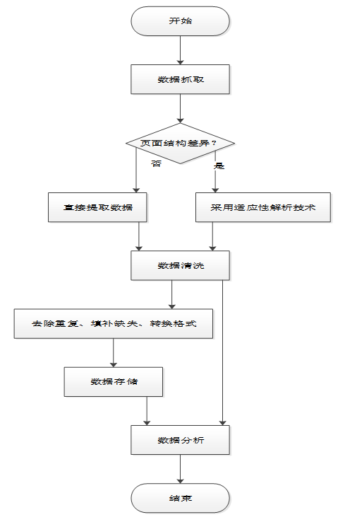 爬虫数据分析流程从开始阶段进入数据抓取,系统通过爬虫技术请求目标电商平台的网页以获取商品信息。接着,系统会检查页面结构是否存在差异,如果页面结构一致,系统可以直接抓取数据;如果页面结构存在差异,系统将采用适应性解析技术,如XPath或正则表达式,来提取有效数据。抓取到的数据将进入数据清洗阶段,系统会去除重复数据、填补缺失值并进行格式转换,确保数据的准确性和规范性。清洗后的数据将被存储在数据库中,为后续的分析做准备。最后,系统对存储的数据进行分析,提供商品比价、价格趋势等信息,帮助用户做出更精准的购物决策。整个流程在此结束。