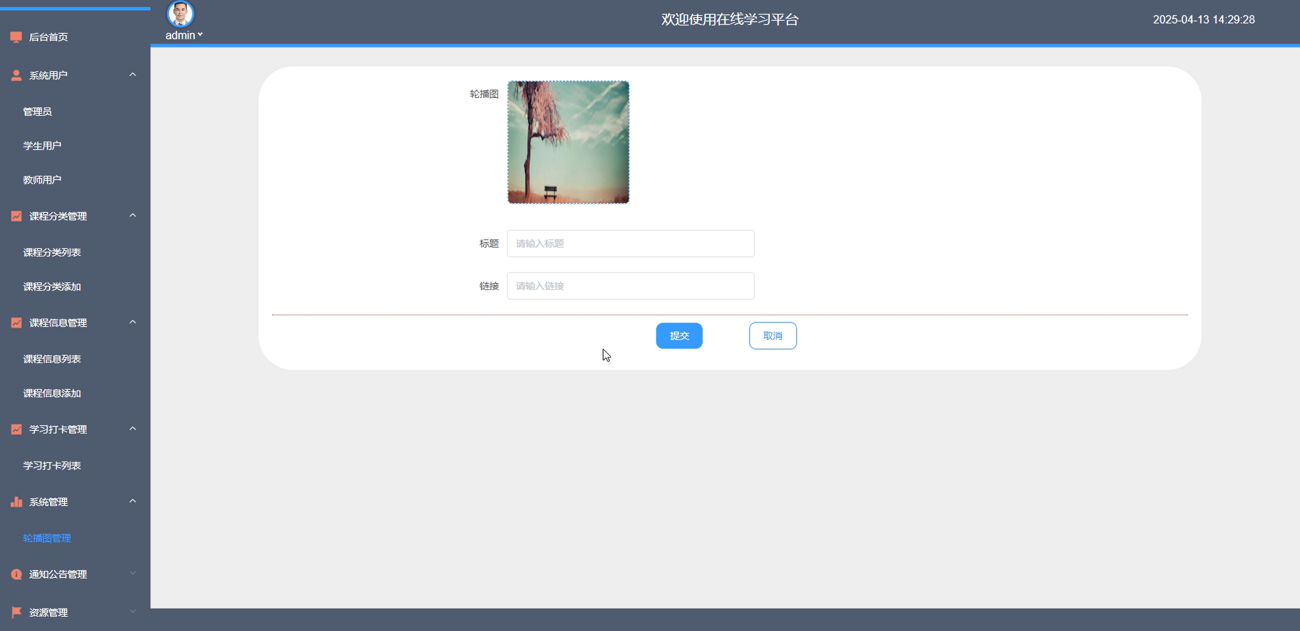 管理员操作轮播图管理功能,精心挑选具有吸引力的图片,如热门课程宣传、重要活动预告等,上传至系统。通过有效管理轮播图,突出平台重点内容,吸引用户目光,提升平台流量转化率。轮播图管理界面如图5-11所示。