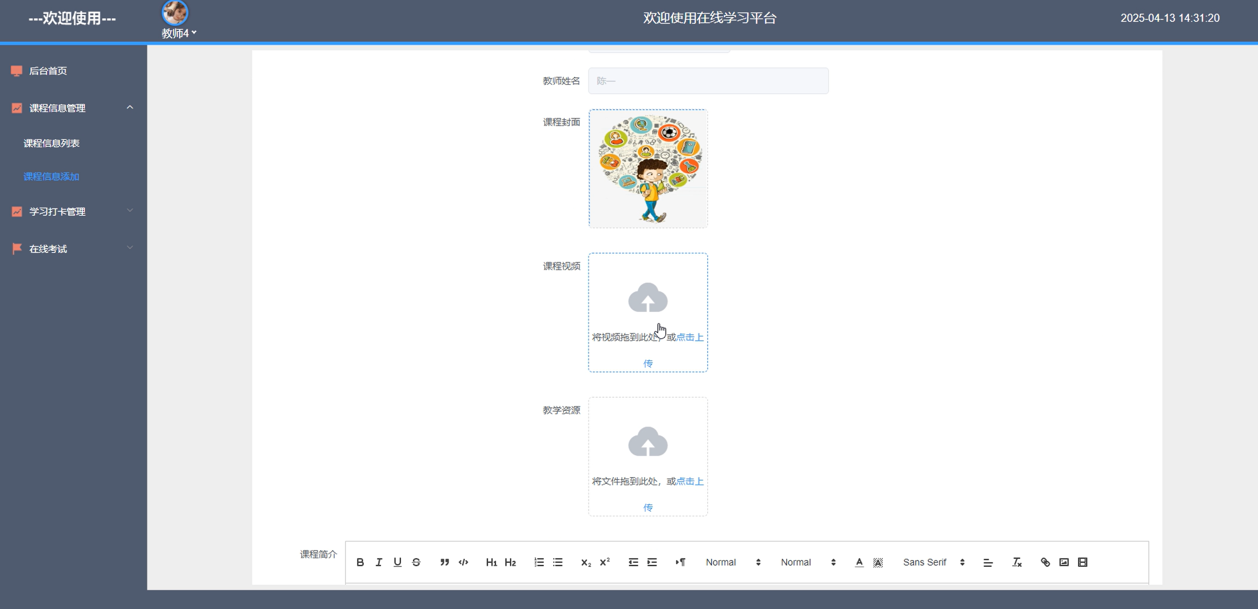 教师登录后台首页,进入课程信息管理模块。在此,可对所授课程全方位把控。添加新课程时,详细录入课程名称、视频及教学资源等信息。针对既有课程,能更新课程内容,上传新的教学视频、资料,优化课程结构。课程信息管理界面如图5-6所示。