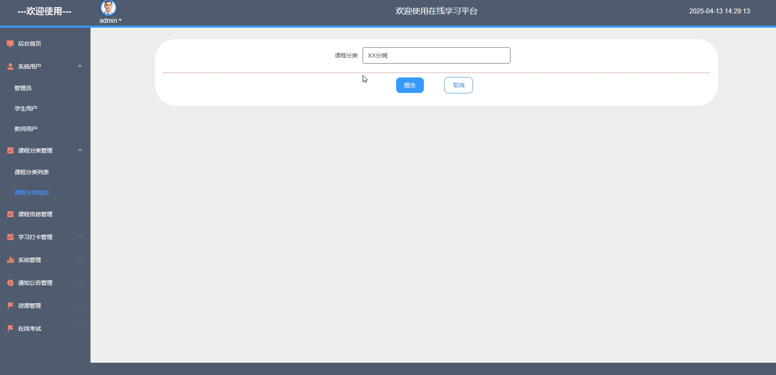 管理员登录后台,进入课程分类管理页面。依据学科特点、教学大纲以及学生需求,构建科学合理的课程分类体系。新增分类时,精准命名并撰写清晰描述,助力用户快速定位。通过持续完善课程分类,提升平台课程检索效率,帮助师生便捷获取资源,推动教学有序开展。课程分类管理界面如图5-9所示。