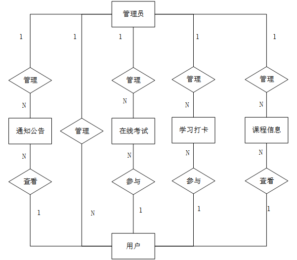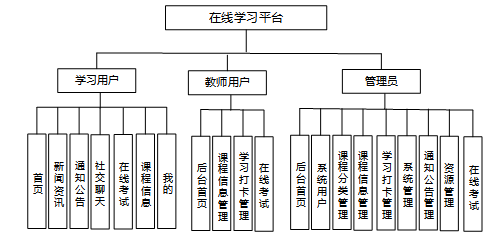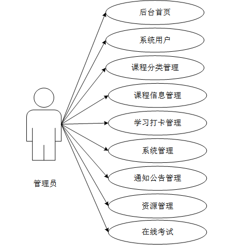 管理员的功能包括后台首页、系统用户(管理员、学生用户、教师用户)、课程分类管理、课程信息管理、学习打卡管理、系统管理(轮播图管理)、通知公告管理、资源管理(新闻资讯、资讯分类)、在线考试(科目列表、试题库、错题记录、试卷列表)。管理员用例图如图3-3所示。