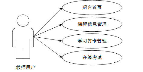 教师用户的功能包括后台首页、课程信息管理、学习打卡管理、在线考试(科目列表、试题库、试卷列表)。教师用户用例图如图3-2所示。
