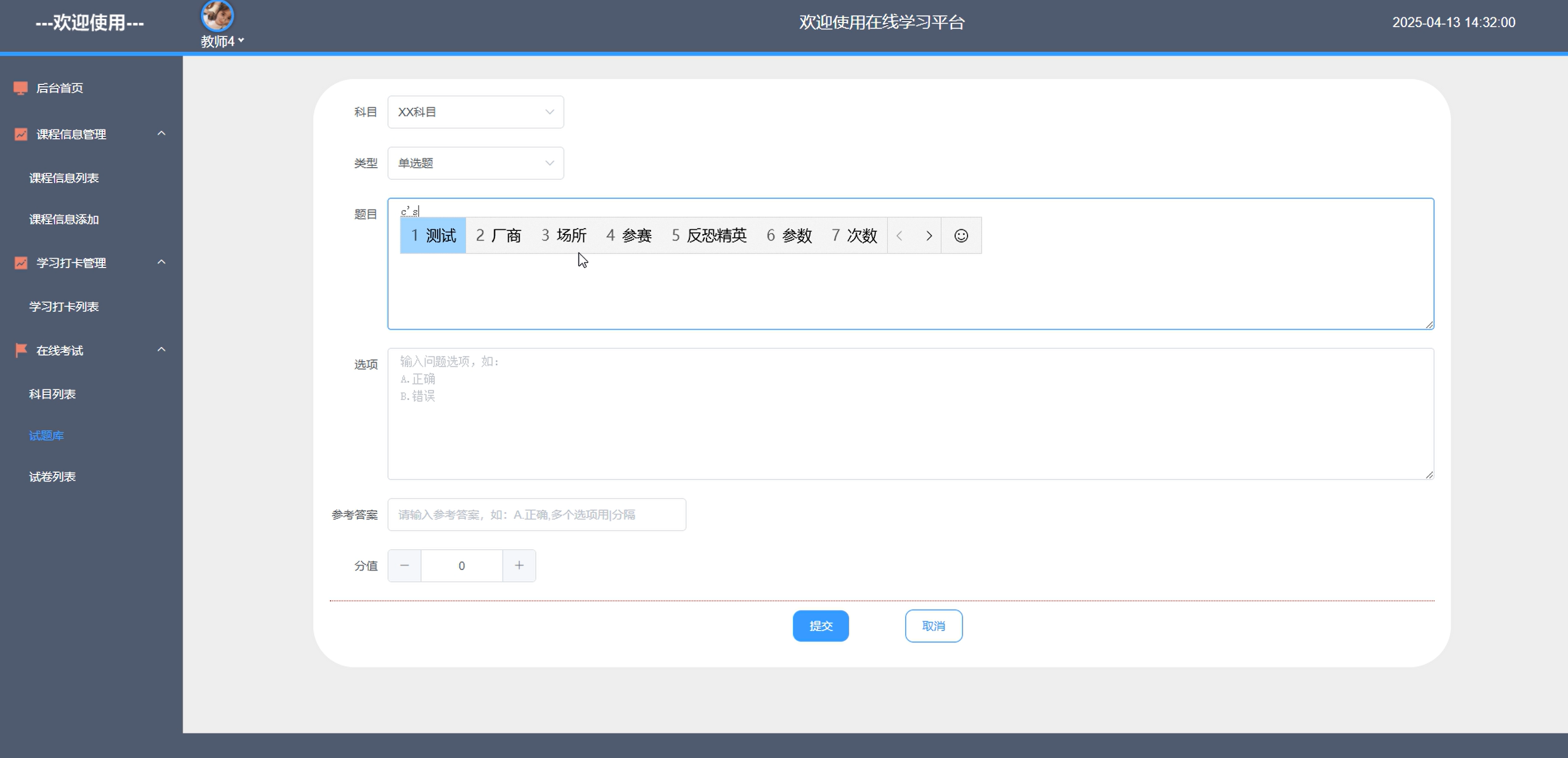 教师登录平台后台,找到在线考试板块中的试题库入口。点击进入后,可选择添加试题。在试题录入页面,教师详细输入题目内容,涵盖单选、多选、判断、简答等各类题型。通过添加试题,丰富试题库资源,为组织高质量考试、精准考查学生知识掌握情况奠定坚实基础,助力教学评估与教学质量提升 。添加试题库界面如图5-7所示。