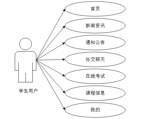 学生用户的功能包括首页、新闻资讯、通知公告、社交聊天、在线考试、课程信息、我的(基本信息、收藏、统计图、学习打卡、错题列表)。学生用户用例图如图3-1所示。
