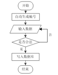 系统开始后自动生成编号,用户输入数据。系统判断输入的数据是否合法,若不合法则返回重新输入;若合法,则将数据写入数据库,最后结束流程。如图3-6所示。