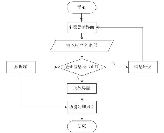 用户从“系统登录界面”开始,输入用户名和密码后,系统验证其信息是否正确。如果验证通过,则进入功能界面并进一步进入功能处理界面,最后流程结束;如果验证失败,则显示“信息错误”,用户需要重新输入。数据库支持验证过程。如图3-4所示。