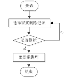 用户首先选择需要删除的记录,然后系统判断是否执行删除操作。如果用户选择不删除,则返回重新选择;如果选择删除,则更新数据库完成记录删除操作,最后结束流程。如图3-7所示。