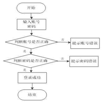 用户输入账号和密码后,系统首先判断账号是否正确,若不正确则提示“账号错误”;如果账号正确,则继续判断密码是否正确,若密码错误则提示“密码错误”;若账号和密码均正确,则显示“登录成功”,最后结束流程。如图3-5所示。