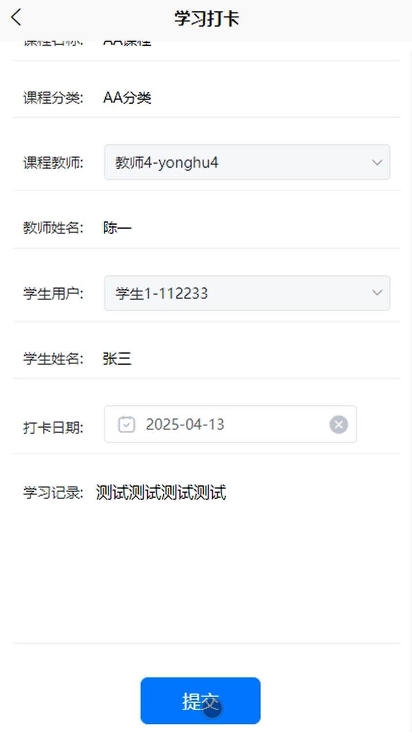 每天完成学习任务后,点击学习打卡按钮,系统记录打卡日期。长期坚持打卡,有助于培养良好学习习惯,形成学习自律性。同时,通过打卡统计图,学生能直观看到自己的学习活跃度变化,激励自己持续学习,保持学习动力。进行学习打卡界面如图5-5所示。