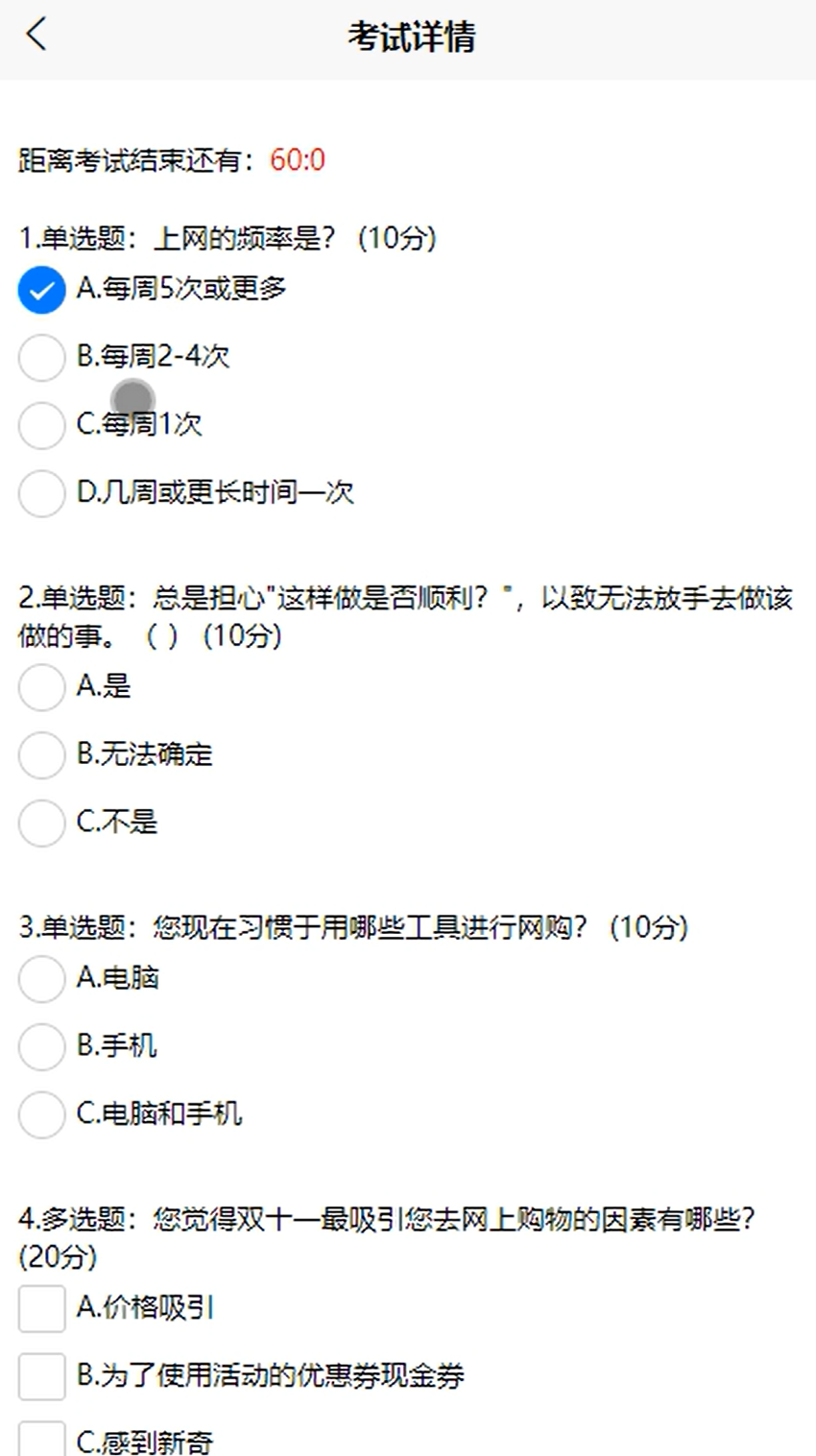 学生在平台首页找到 “在线考试” 入口并点击进入。系统呈现各类考试安排,学生按需选择考试,进入答题界面。答题结束提交后,通过在线考试,学生能及时检验知识掌握程度,明确学习薄弱点。参与在线考试界面如图5-3所示。