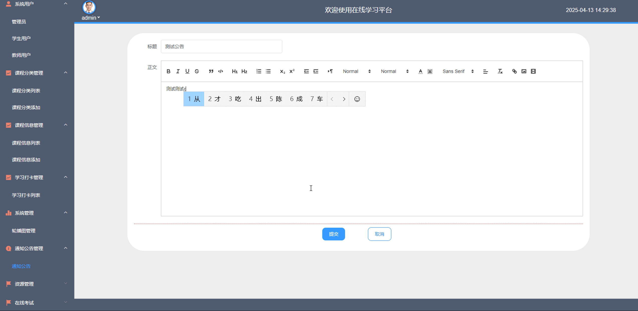 在通知公告管理模块,管理员编辑各类重要信息。发布后,用户能在平台醒目位置接收通知,保障关键信息有效传达,维持平台运营秩序。通知公告管理如图5-10所示。