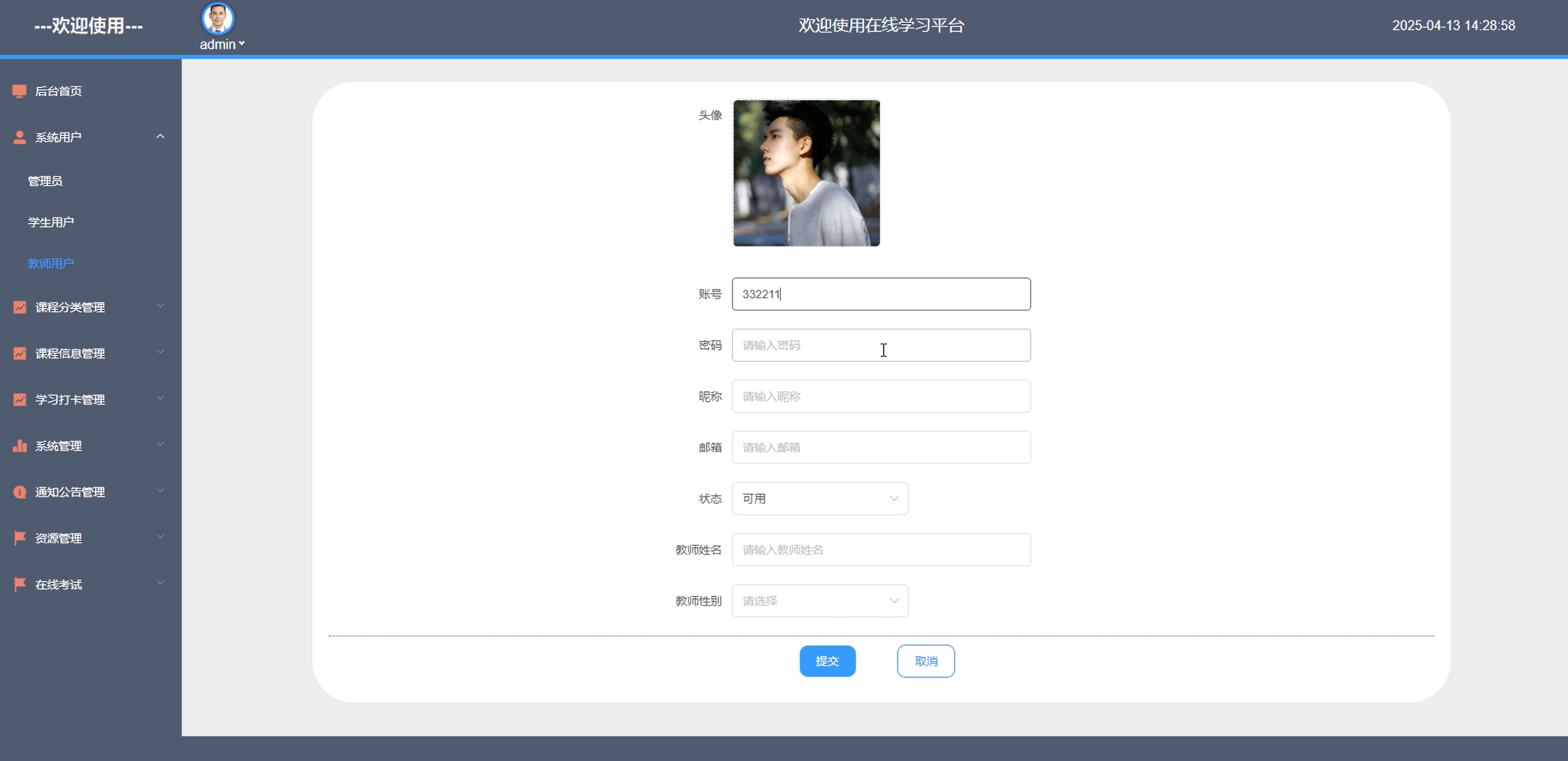 管理员可以通过系统用户管理功能,对所有用户进行集中管理。这包括管理员账户学生用户和教师用户的创建、权限分配、信息修改和账号禁用等操作。管理员可以查看用户的注册信息、登录记录和使用行为,确保系统的用户管理规范有序。系统用户管理界面如图5-8所示。