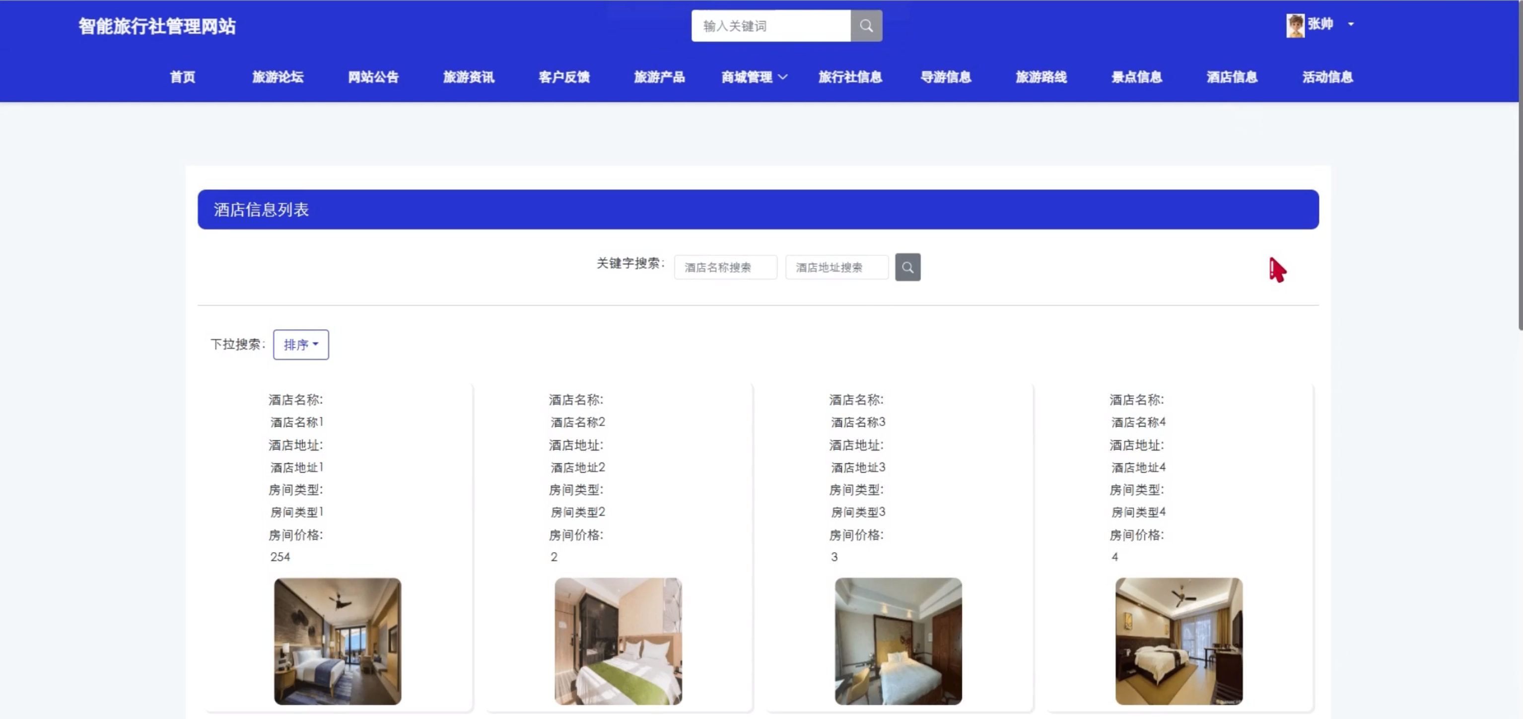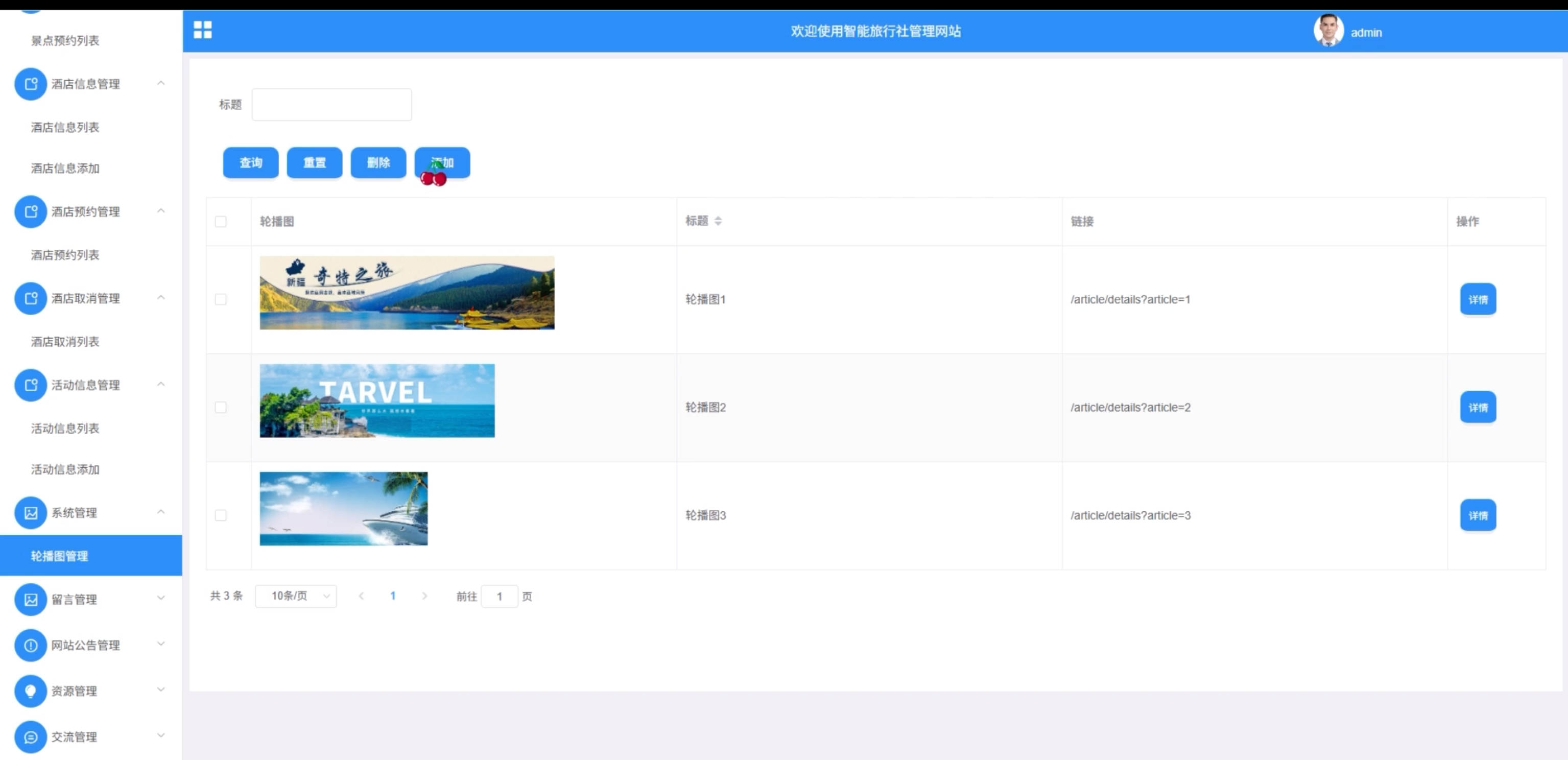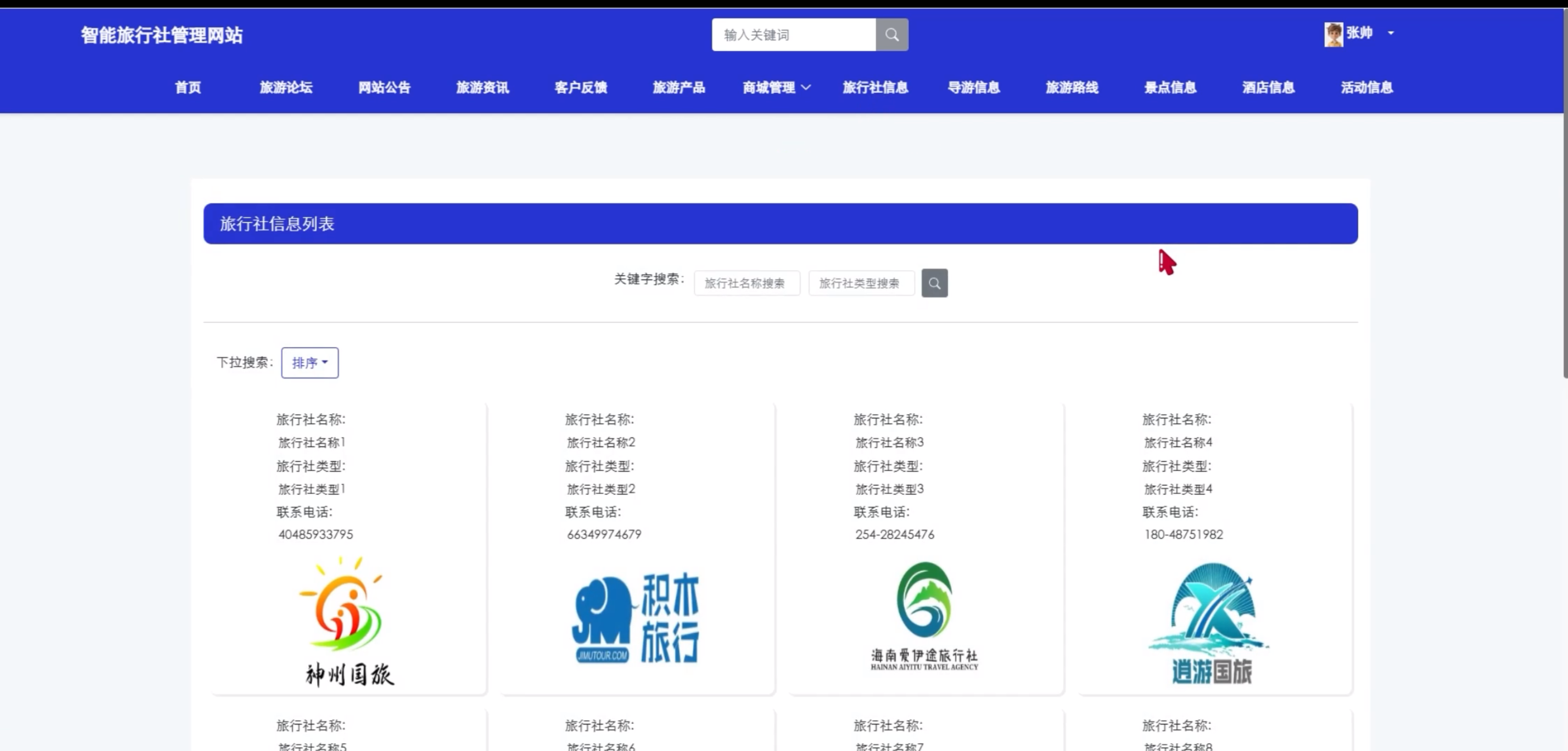 (2)首页:首页展示轮播图、旅游论坛、网站公告、旅游资讯、客户反馈、旅游产品等、商城管理、旅行社信息、导游信息、旅游路线、景点信息、酒店信息、活动信息等功能导航栏。