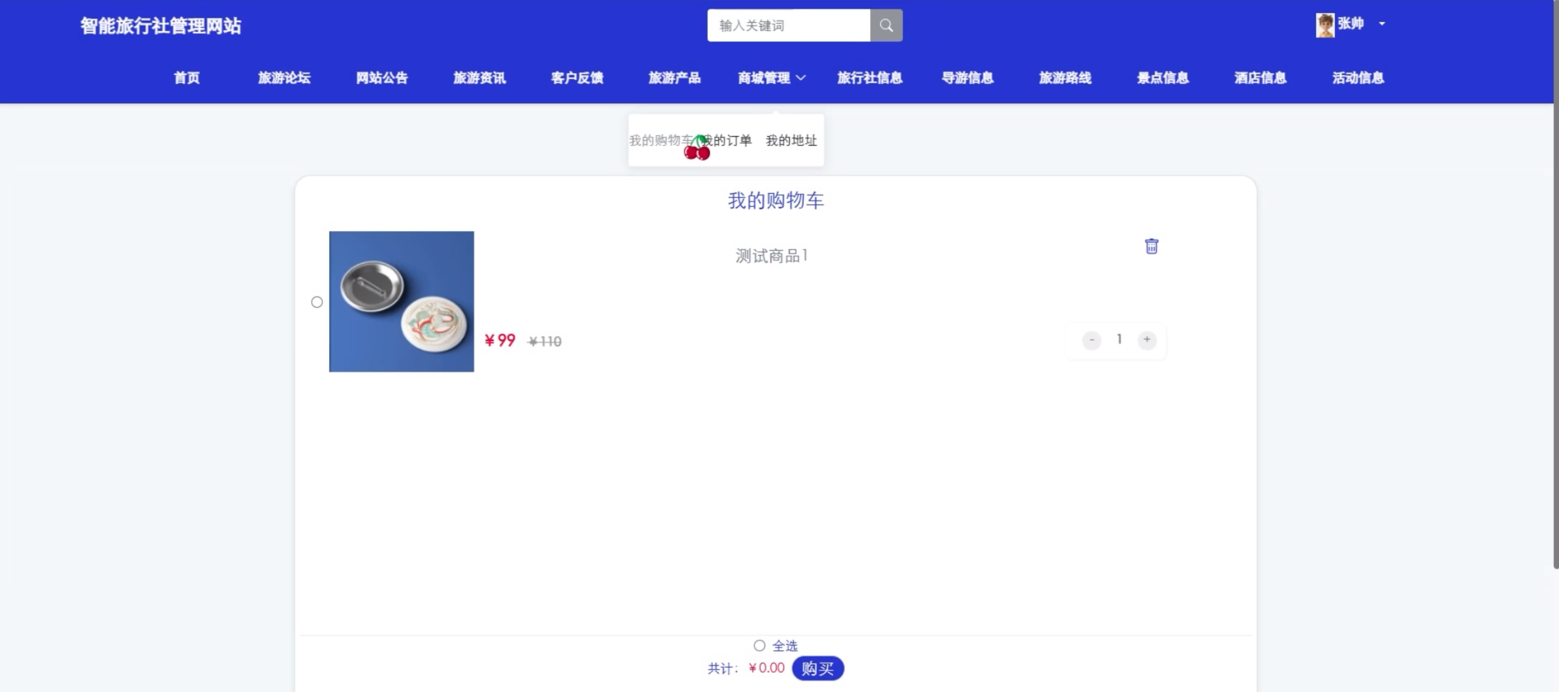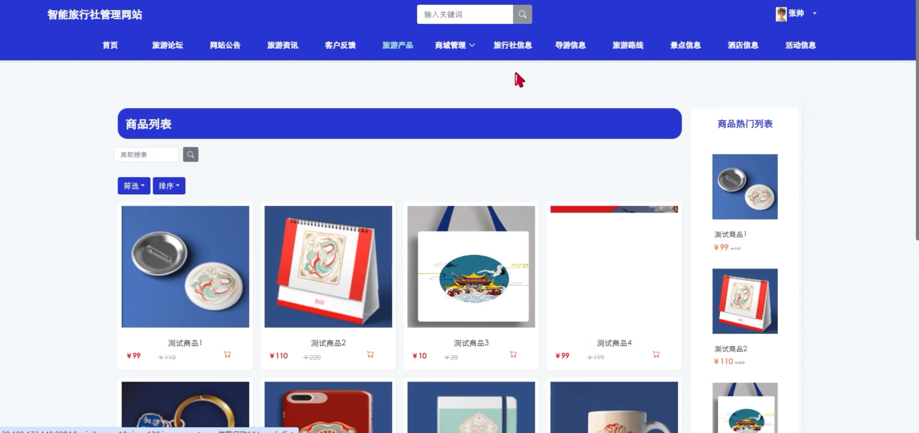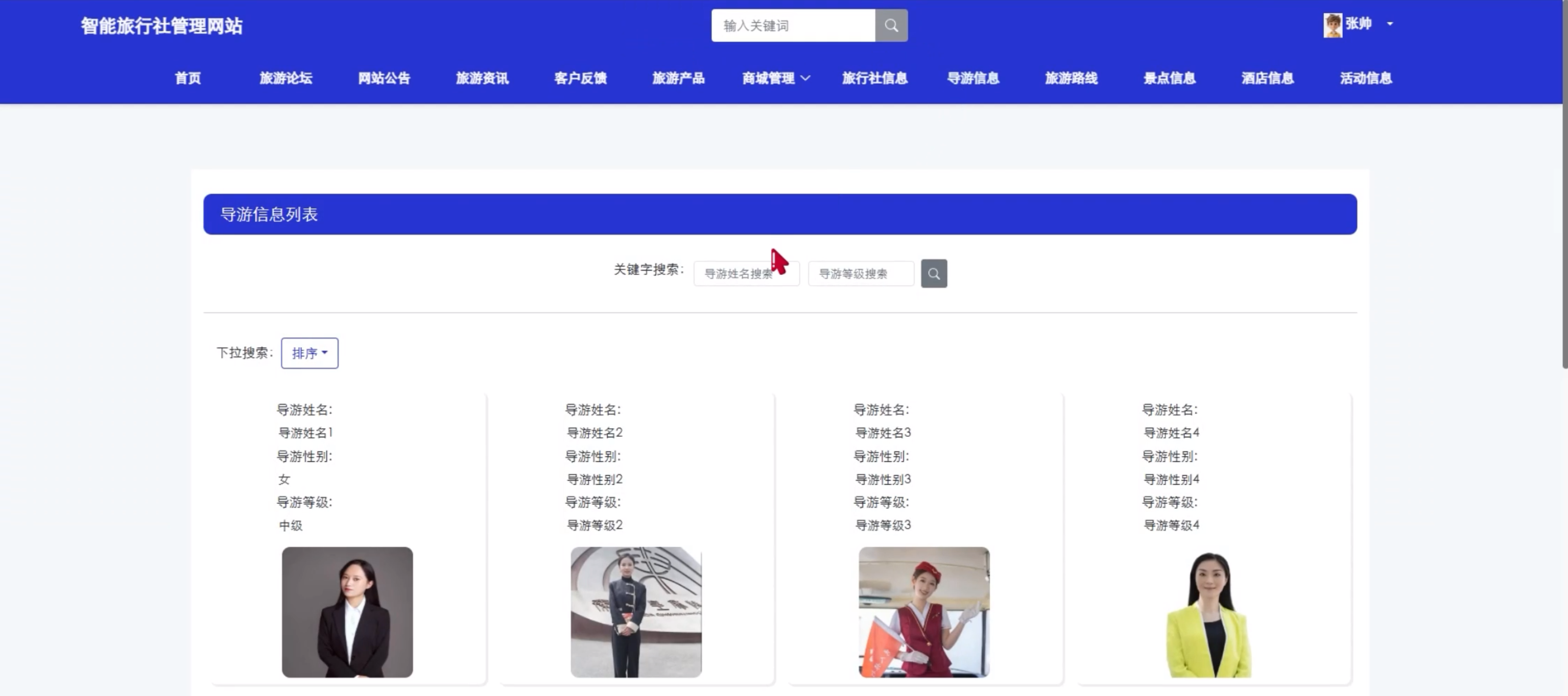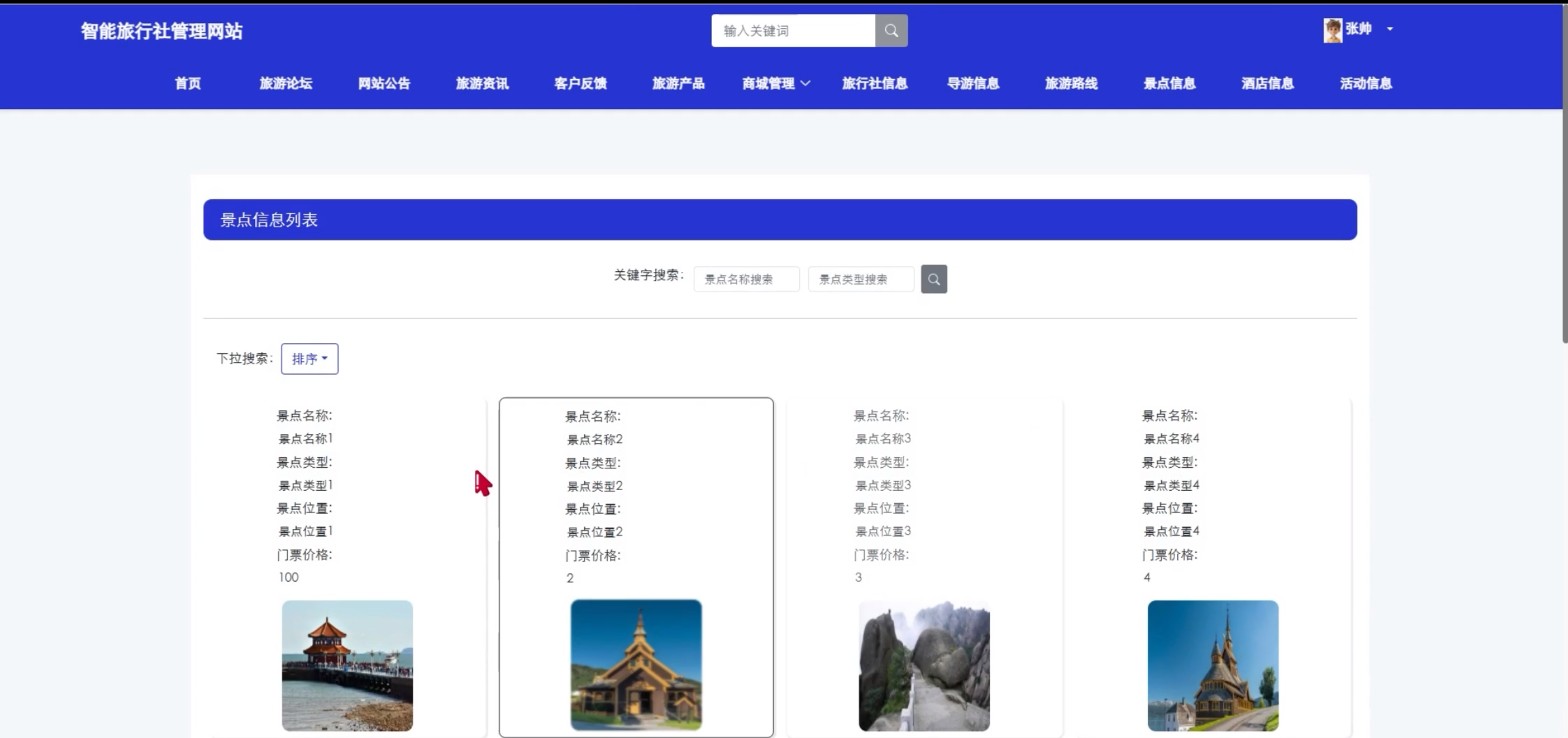 (2)首页:首页展示轮播图、旅游论坛、网站公告、旅游资讯、客户反馈、旅游产品等、商城管理、旅行社信息、导游信息、旅游路线、景点信息、酒店信息、活动信息等功能导航栏。
