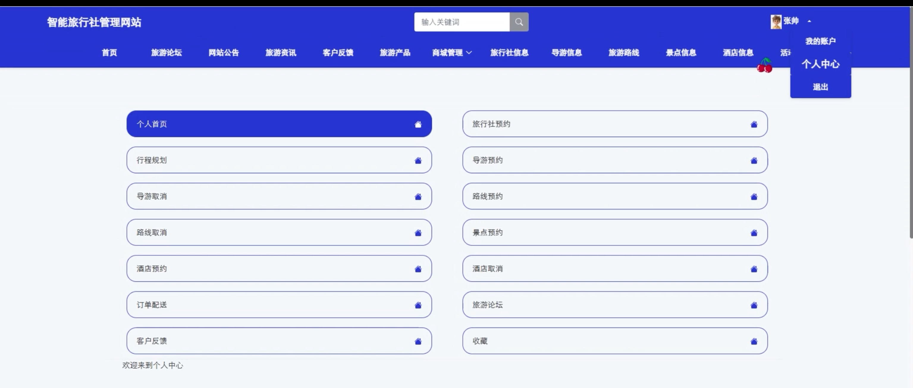 个人中心:个人中心包含多个功能模块,如个人首页、旅行社预约、行程规划、导游预约、导游取消、路线预约、路线取消、景点预约、酒店预约、酒店取消、订单配送、旅游论坛、客户反馈和收藏。用户可在个人中心对相关信息进行查看和管理。界面如下图所示。
