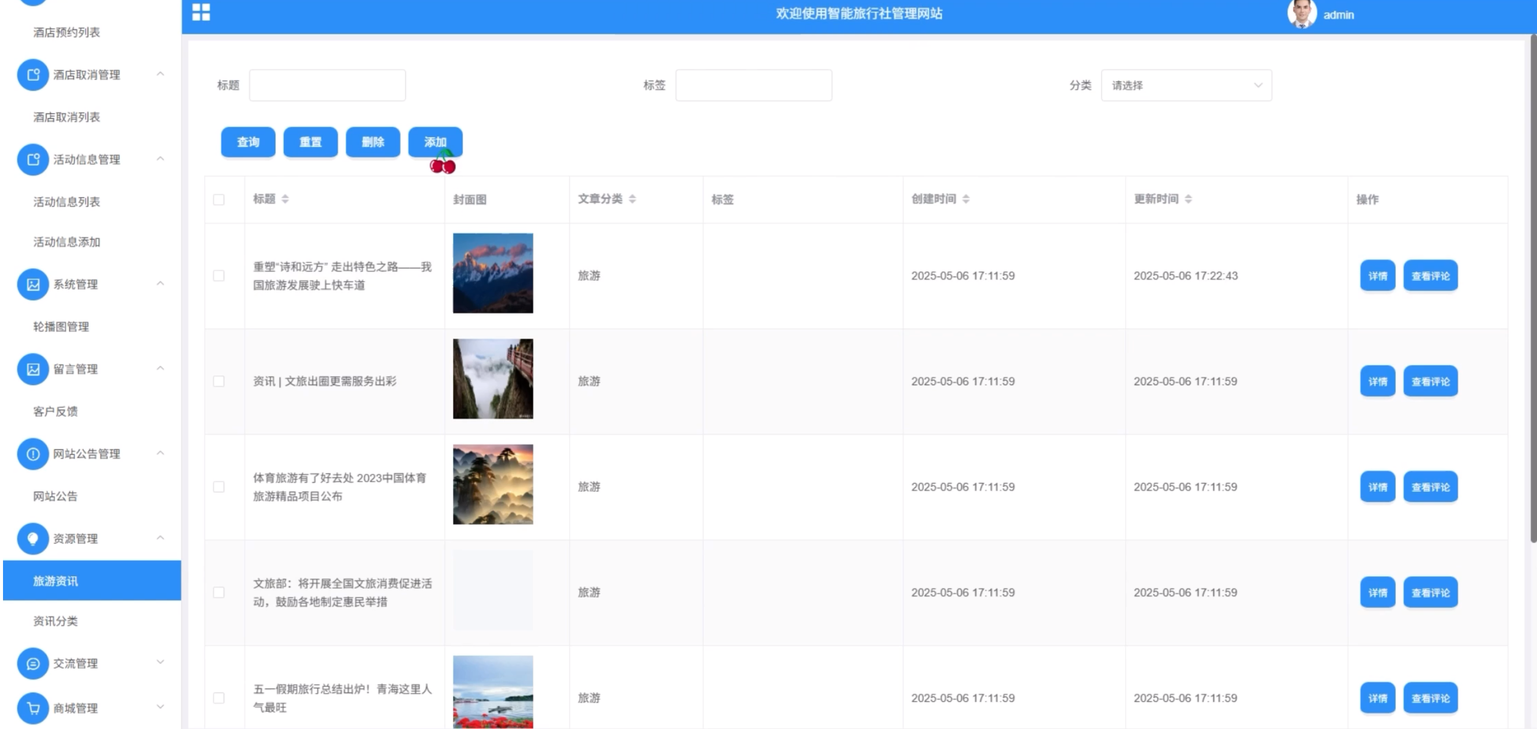 资源管理:管理员点击可查看旅游资讯和资讯分类;如需添加新的资讯,点击“添加”按钮,上传封面图,输入标题,选择分类,输入标签、描述和正文,点击“确认”按钮进行添加。同时可对资讯和分类行增删改查。界面如下图所示。