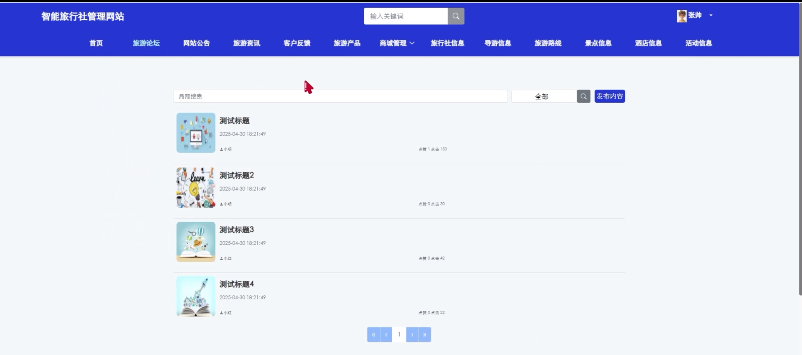 (3)旅游论坛:用户点击可查看旅游论坛帖子列表,可对帖子进行查看、点赞、收藏和评论;同时可点击“发布内容”按钮填写论坛发布信息,包括封面图、标题、分类、标签和正文。