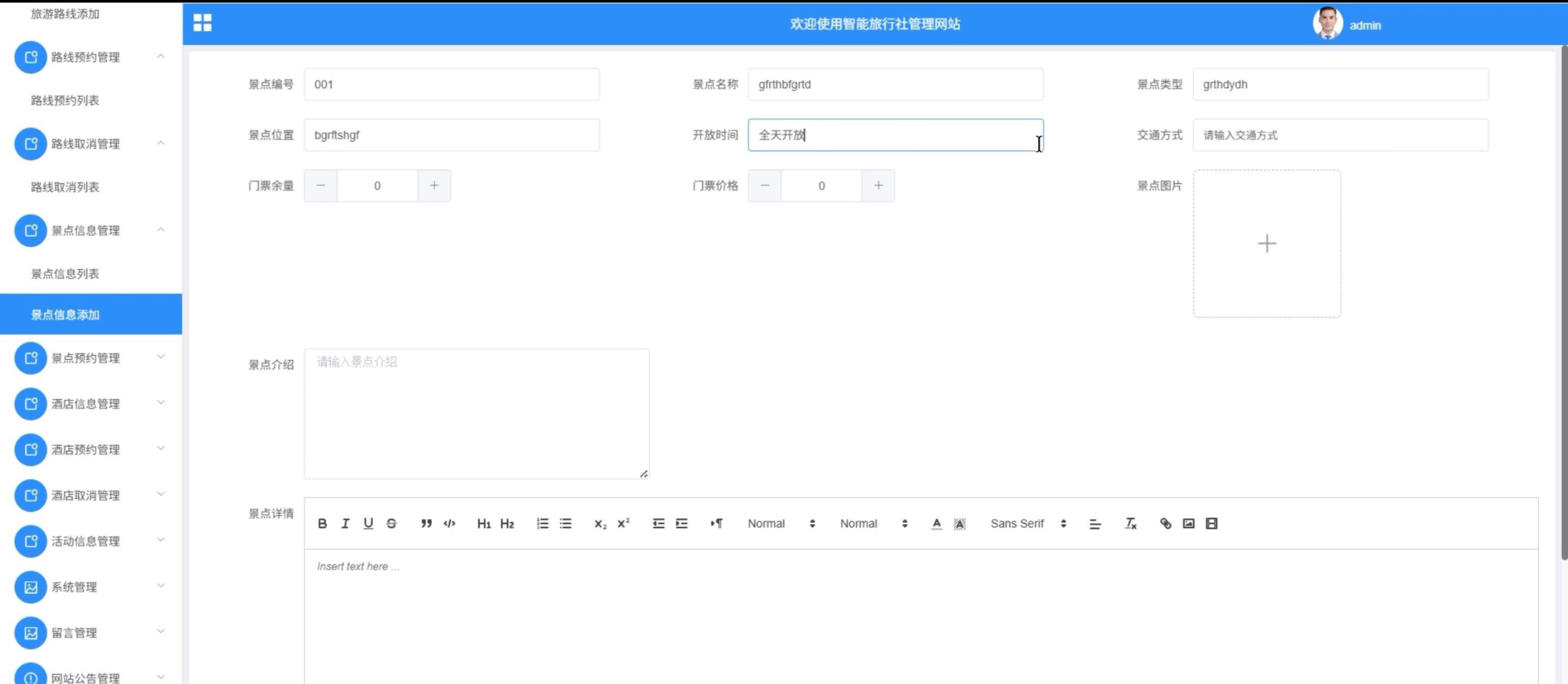 景点信息管理:管理员点击可查看景点信息列表和景点信息添加;点击进入“景点信息添加”可填写相关信息,包括景点编号、景点名称、景点类型、景点位置、开放时间、交通方式、门票景点、门票价格、景点图片、景点介绍和景点详情。界面如下图所示。