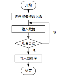 用户首先选择需要修改的记录,输入修改后的数据,系统判断输入数据是否合法。若数据不合法,提示重新输入;若数据合法,则将修改后的数据写入数据库,完成操作后流程结束。修改信息流程图如图3-7所示。
