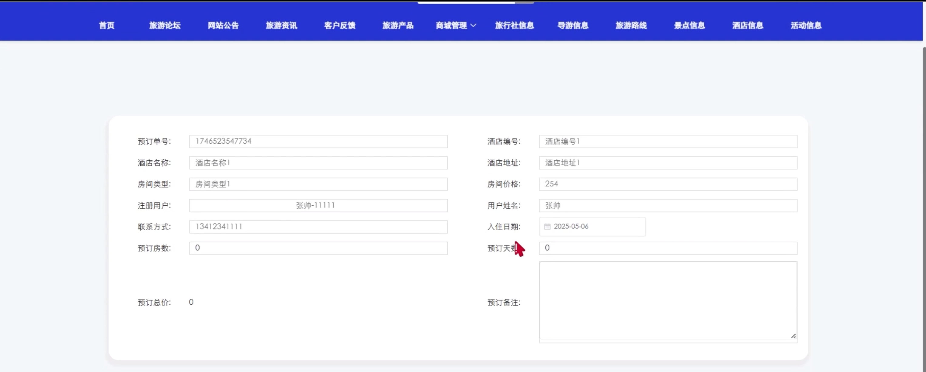 This system adopts a front-end and back-end separation architecture. The back-end is developed based on the Java language and the Spring Boot framework, combined with the MySQL database and MyBatis persistence layer technology, which improves the maintainability and scalability of the system. The front end uses mainstream front-end frameworks (such as Vue.js) for responsive design to ensure good cross-platform compatibility and interactive experience. The system realizes role permission control through the RBAC permission model, ensuring data security and operational standardization. In addition, the system integrates diversified functional modules such as reservation management, commodity trading, information release and interactive communities, building an online tourism service platform that combines intelligence, informatization and socialization. It has strong practical value and promotion potential, and can provide strong support for the digital transformation of the tourism industry.