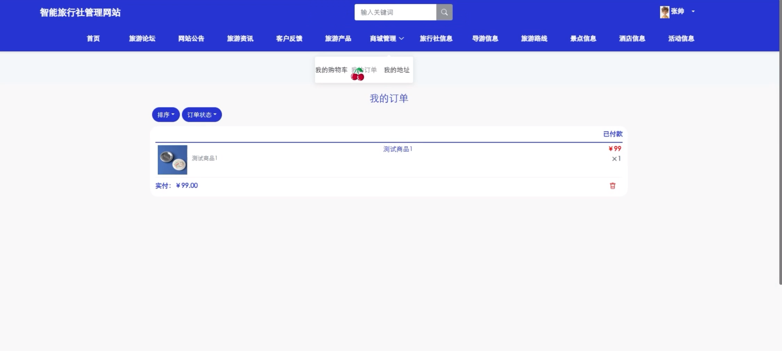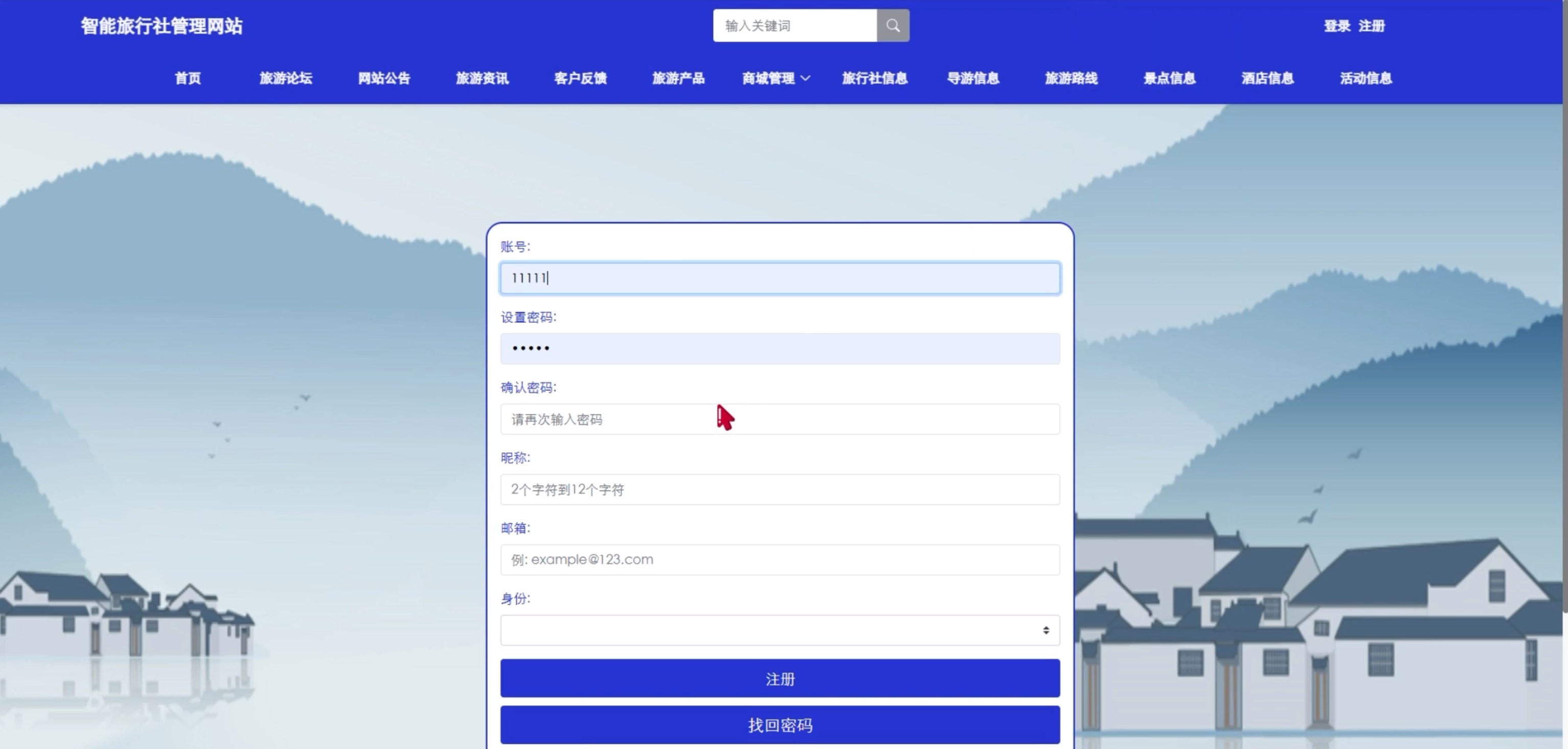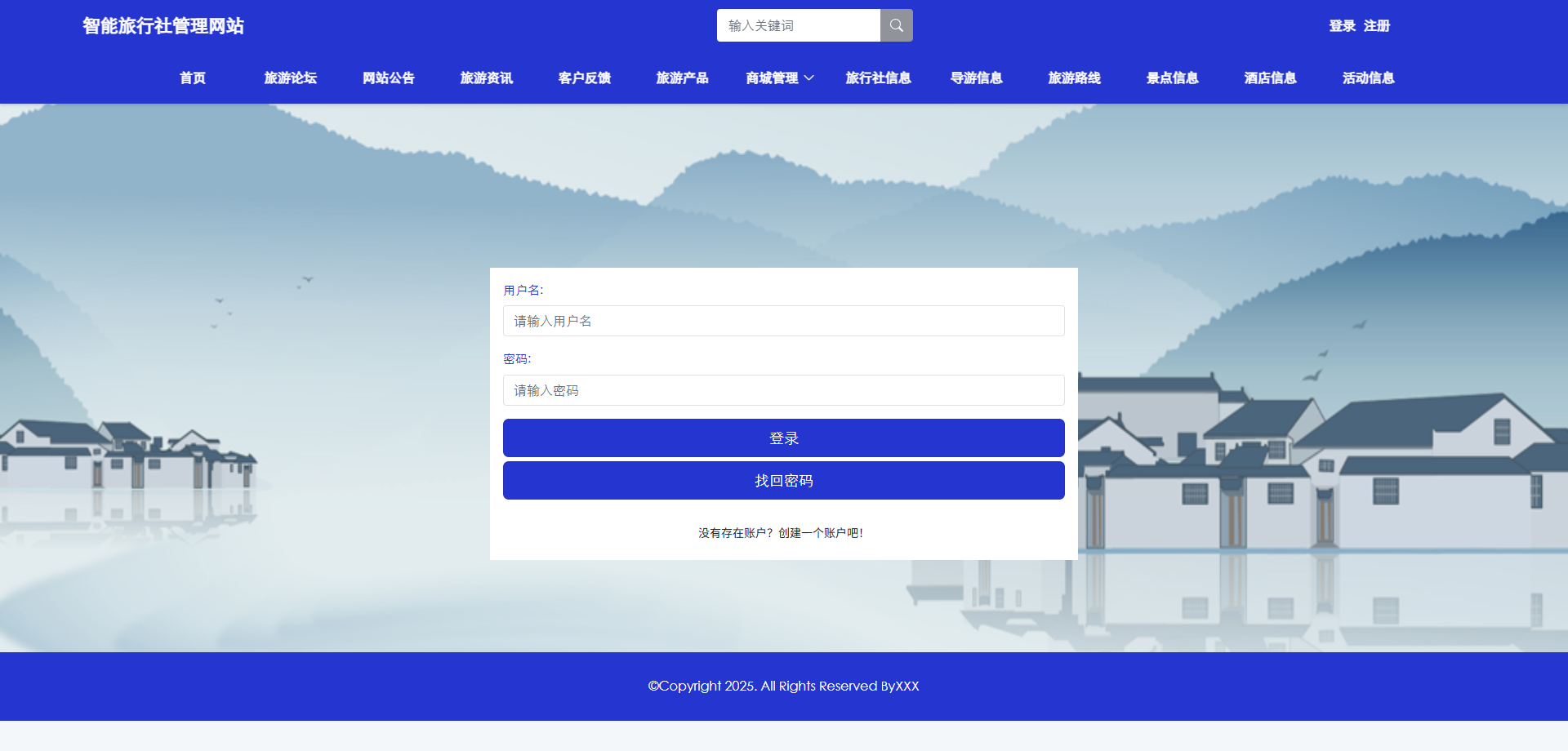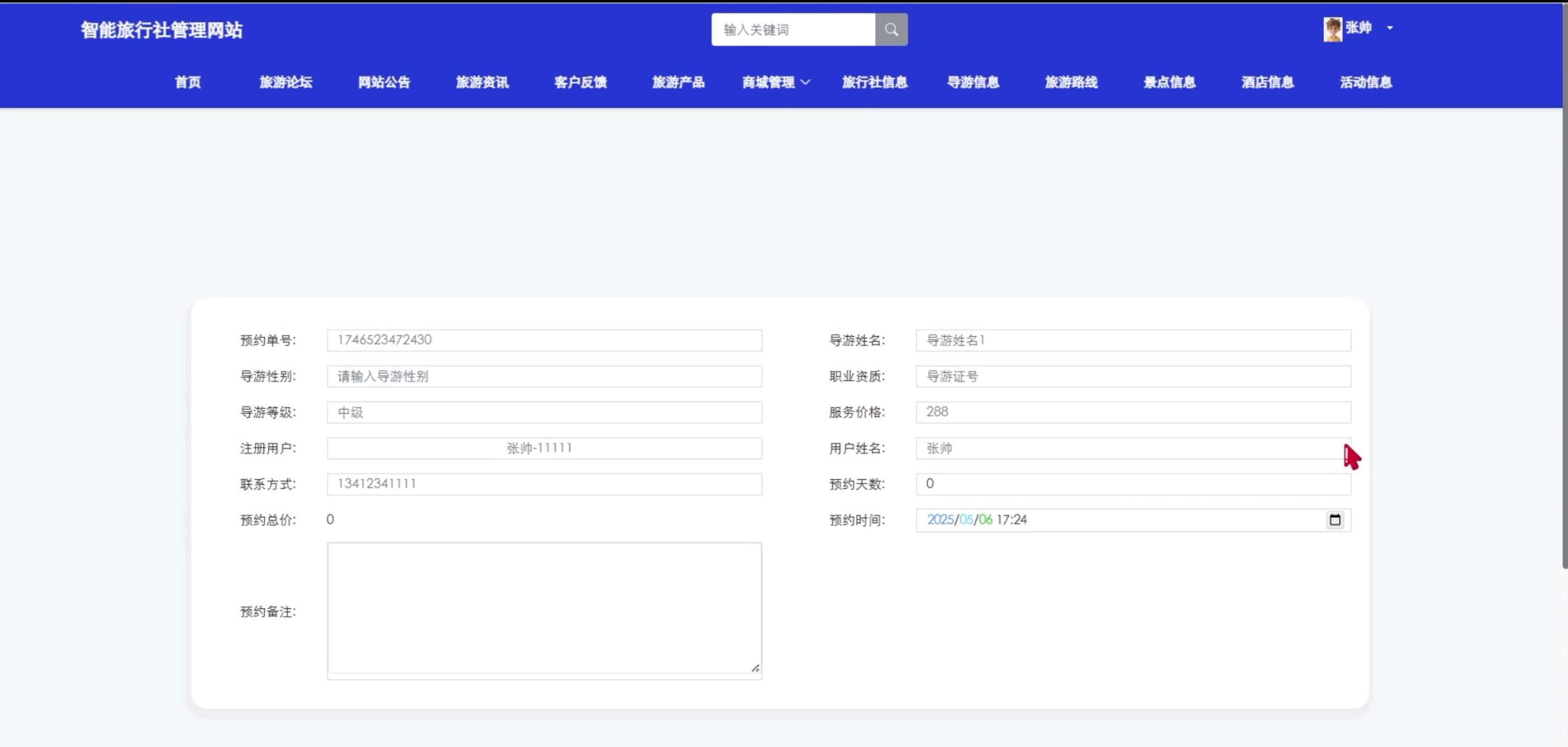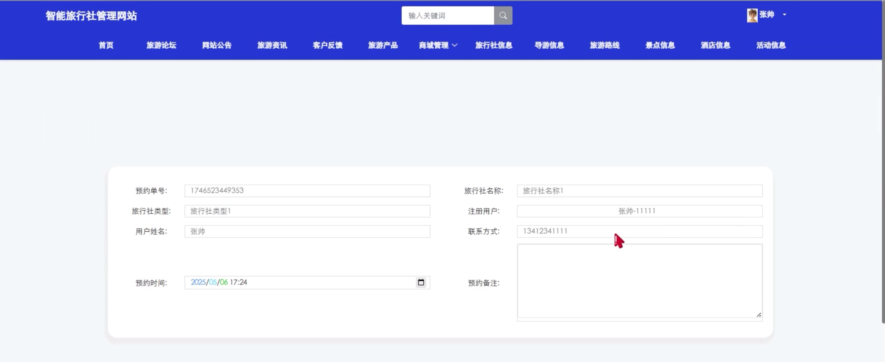 本系统基于Spring Boot框架,构建了一个功能全面、响应迅速的智能旅行社管理网站,涵盖了用户端与管理端的核心业务流程。在开发过程中,采用了前后端分离的设计模式,提升了系统的可维护性和扩展性;通过模块化设计,实现了旅游信息展示、在线预约、互动社区、订单管理、用户反馈等多个功能模块的高效整合。系统不仅满足了用户对旅游服务便捷化、个性化的需求,也为平台管理者提供了数据统计、资源调度和信息发布等实用工具,为旅游行业的信息化建设提供了有力支撑。