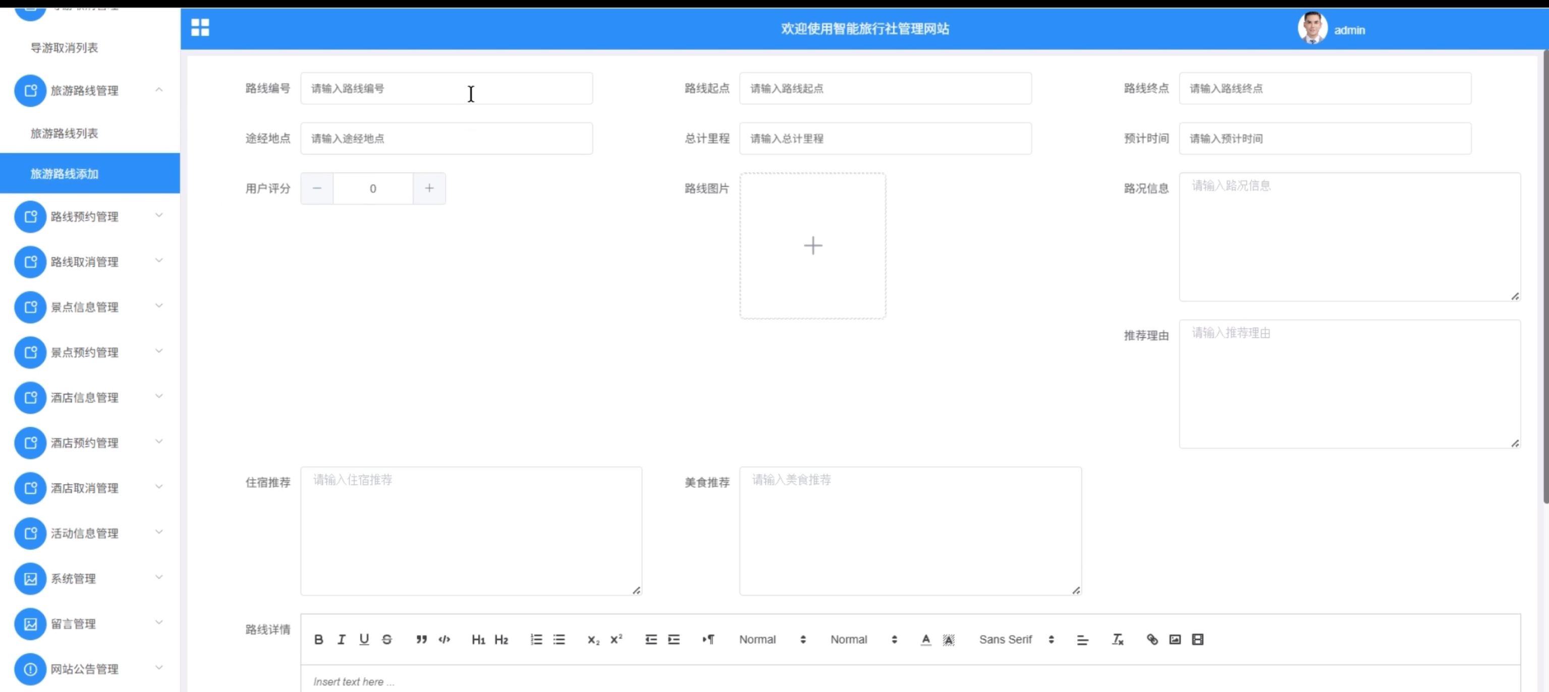旅游路线管理:管理员点击可查看旅游路线列表和旅游路线添加;点击进入“旅游路线添加”可填写相关信息,包括路线编号、路线起点、路线终点、途径地点、总计里程、预计时间、用户评分、路线图片、路况情况、推荐理由、住宿推荐、美食推荐和路线详情。界面如下图所示。