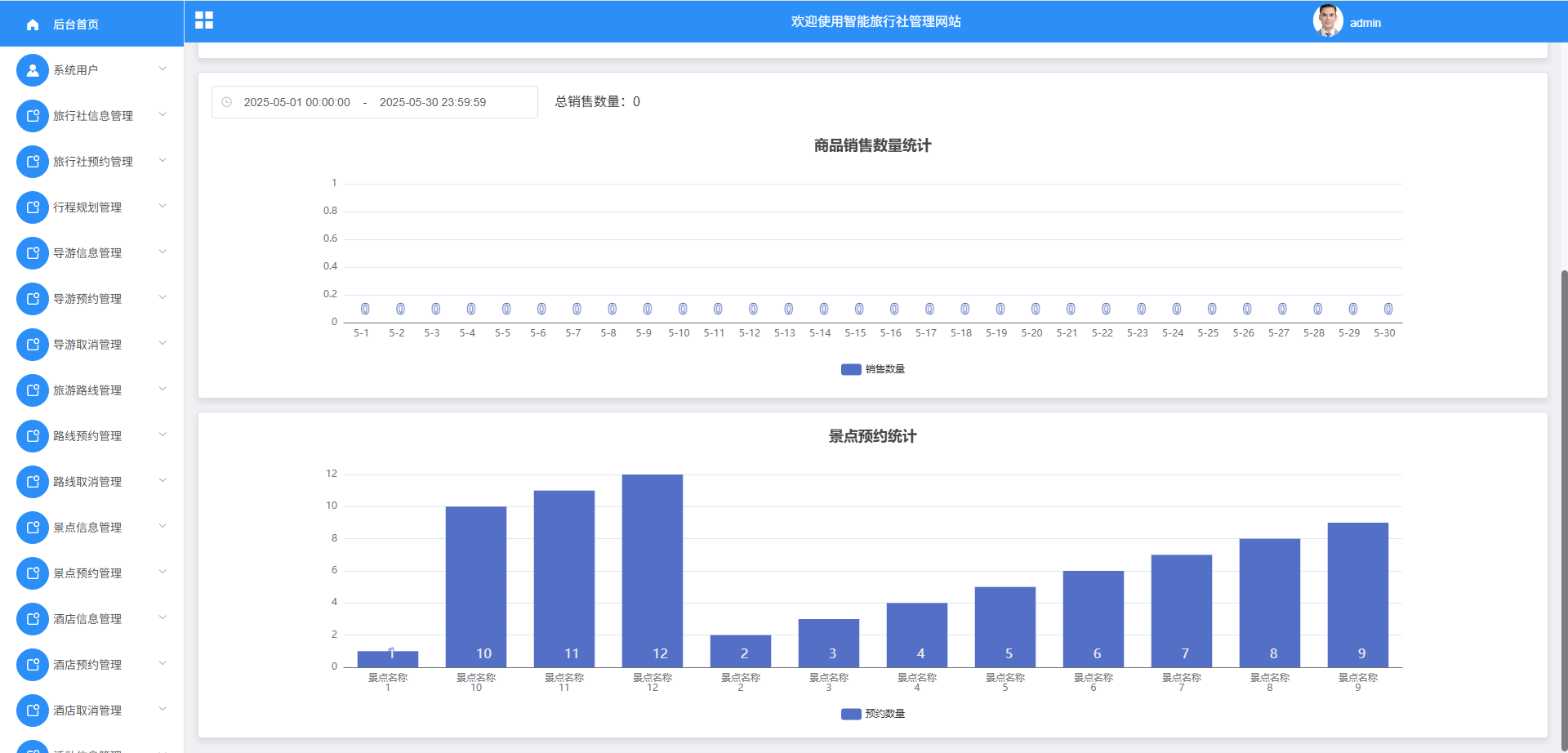 (2)后台首页:管理员点击可查看商品销售信息、销售金额、注册用户、景点预约等信息数据统计图,便于进行决策和管理。