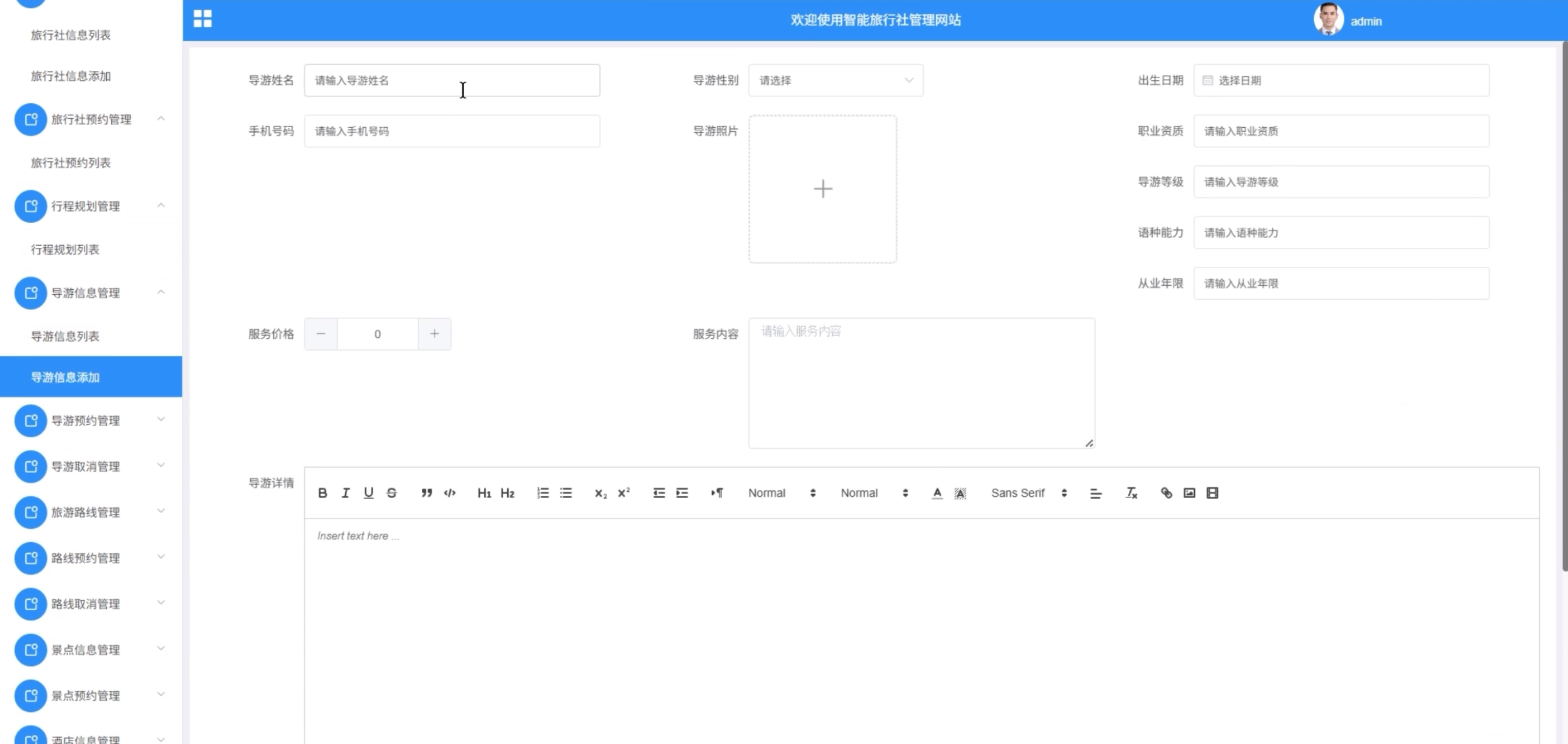 导游信息管理:管理员点击可查看导游信息列表和导游信息添加;点击进入“导游信息添加”可填写相关信息,包括导游姓名、导游性别、出生日期、手机号码、导游图片、职业资质、导游等级、语种能力、从业年限、服务价格、服务内容和导游详情。界面如下图所示。