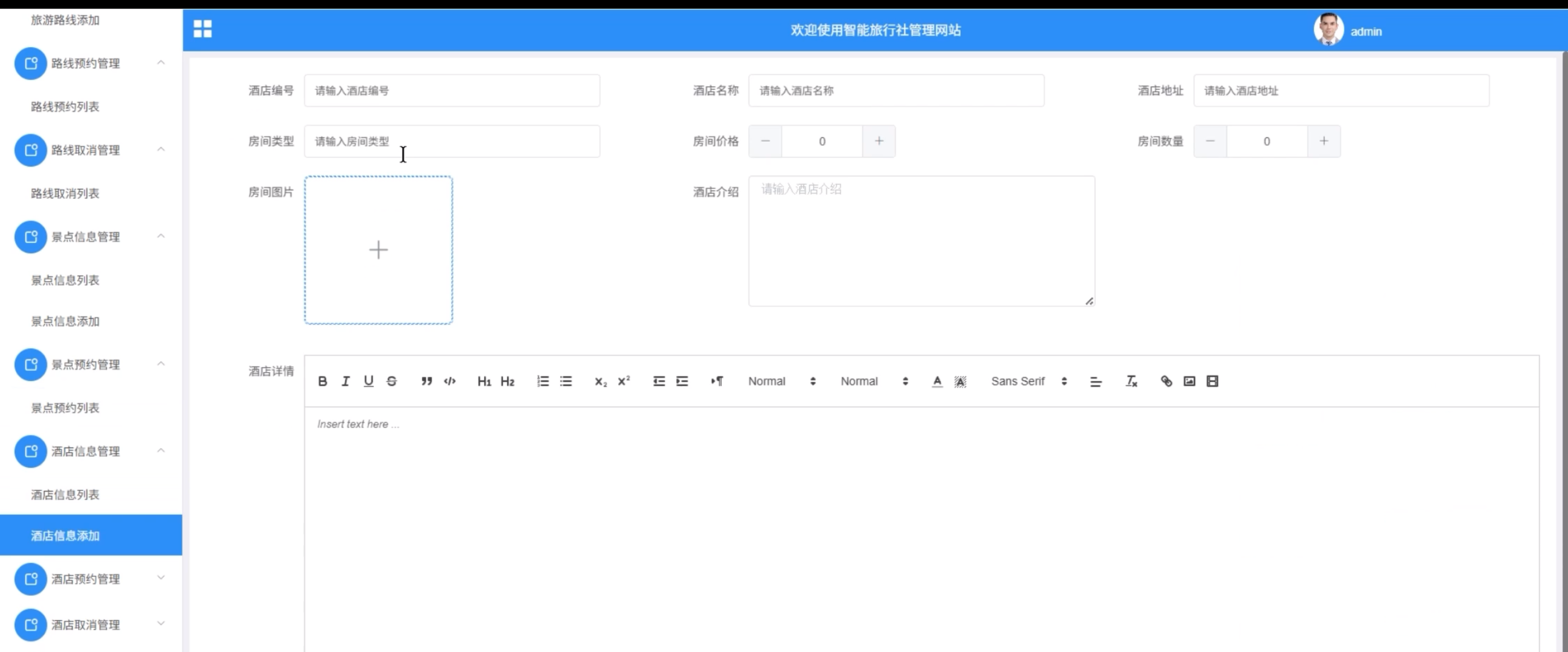 酒店信息管理:管理员点击可查看酒店信息列表和酒店信息添加;点击进入“酒店信息添加”可填写相关信息,包括酒店编号、酒店名称、酒店地址、房间类型、房间价格、房间数量、房间图片、酒店介绍和酒店详情。界面如下图所示。