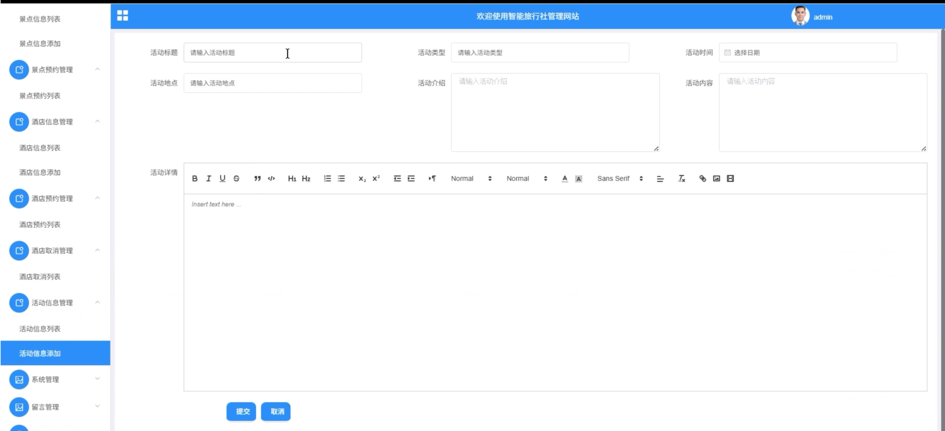 活动信息管理:管理员点击可查看活动信息列表和活动信息添加;点击进入“活动信息添加”可填写相关信息,包括活动标题、活动类型、活动时间、活动地点、活动介绍、活动内容和活动详情。界面如下图所示。