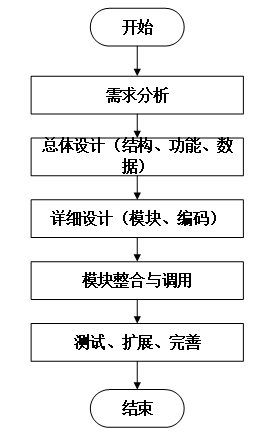 系统开发流程的主要步骤,从需求分析到系统完成的全过程。流程包括需求分析、总体设计(结构、功能、数据)、详细设计(模块、编码)、模块整合与调用,以及测试、扩展和完善,最终完成系统的开发。本系统的开发流程如图3-3所示