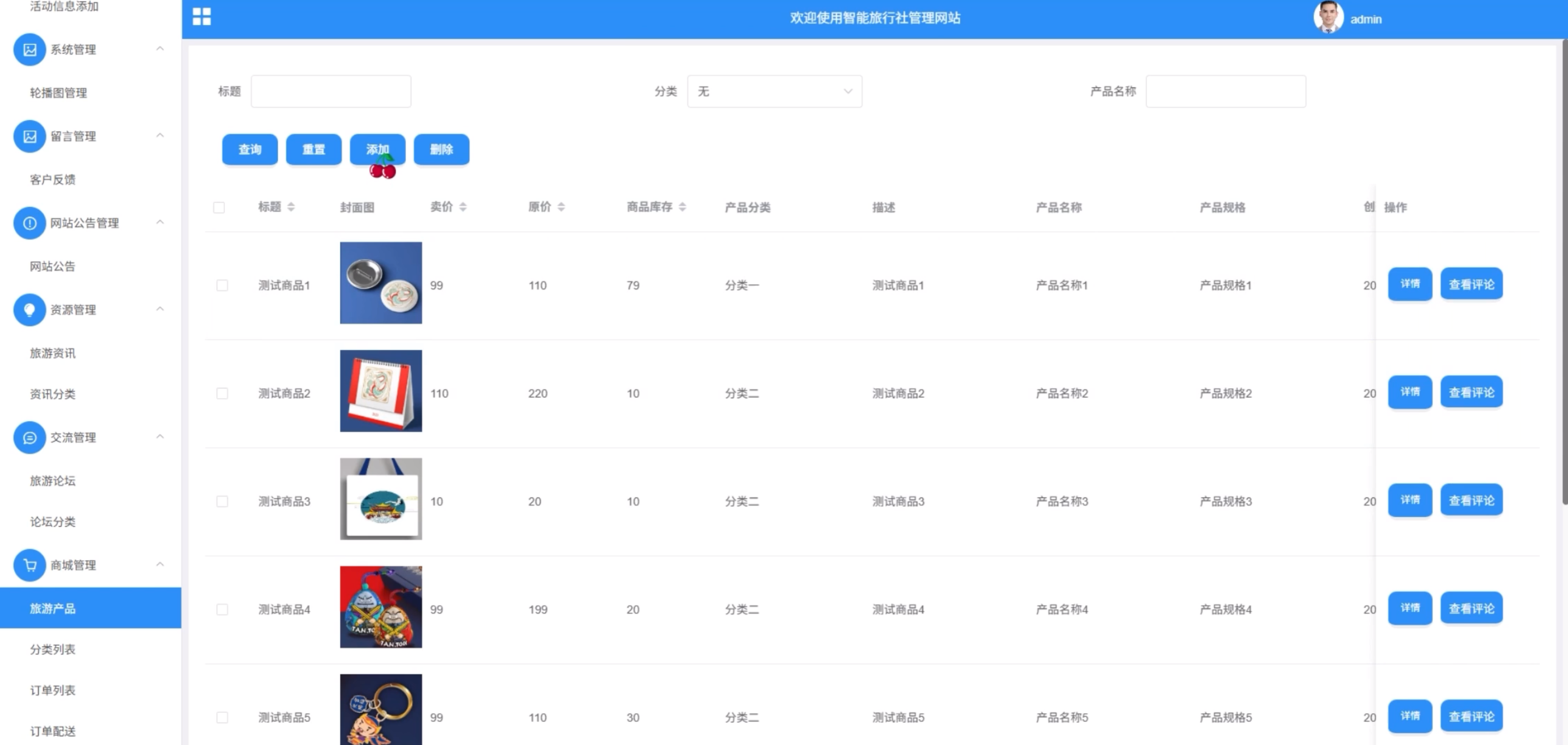 商城管理:商城管理:商城管理包含多个功能模块,如旅游产品、分类列表、订单列表、订单配送。点击进入“订单列表”可查看用户下单信息,同时点击“配送”按钮进行商品配送;点击进入“订单配送”可对配送状态和签收状态进行修改。点击进入”旅游产品“可添加新的文创信息,包括封面图、主图、标题、描述、原价、卖价、库存、分类、产品名称、产品规格和正文。界面如下图所示。