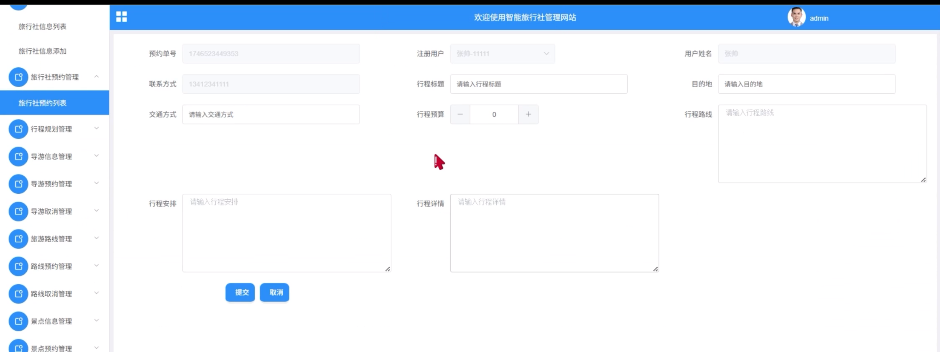 (5)旅行社预约管理:管理员点击可查看旅行社预约列表,点击“详情”按钮可查看预约详情信息,点击“行程规划”可添加规划信息,包括交通方式、行程预算、行程安排和行程详情。