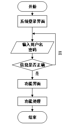 用户首先进入系统登录界面,输入用户名和密码后,系统验证信息是否正确。若验证失败,返回登录界面重新输入;若验证成功,则进入功能界面,执行相应功能处理后结束操作流程。操作流程如图3-5所示。