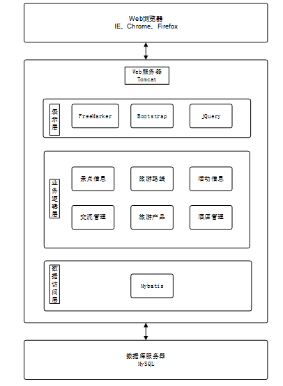 系统由表现层、业务逻辑层、数据访问层和数据库服务器组成。表现层通过浏览器(如IE、Chrome、Firefox)与用户交互,采用FreeMarker、Bootstrap、jQuery等技术实现界面呈现。业务逻辑层负责处理系统的核心业务逻辑,通过分模块设计实现功能分离。数据访问层使用MyBatis框架连接数据库,执行数据的增删改查操作。数据库服务器采用MySQL进行数据存储和管理,为系统提供稳定的数据库支持。整个架构通过Tomcat服务器完成用户请求的接收和处理,确保系统的高效运行[8]。整个系统架构如图4-1所示。