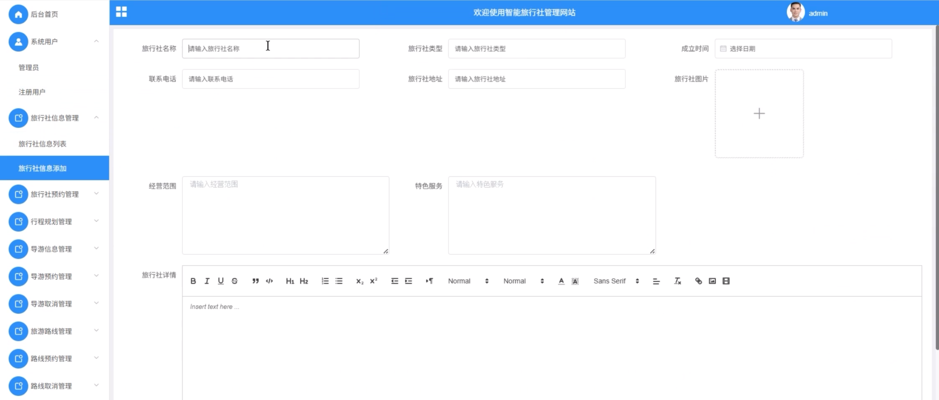 旅行社信息管理:管理员点击可查看旅行社信息列表和旅行社信息添加;点击进入“旅行社信息添加”可填写相关信息,包括旅行社名称、旅行社类型、成立时间、联系电话、旅行社地址、旅行社图片经营范围、特色服务和旅行社详情。界面如下图所示。