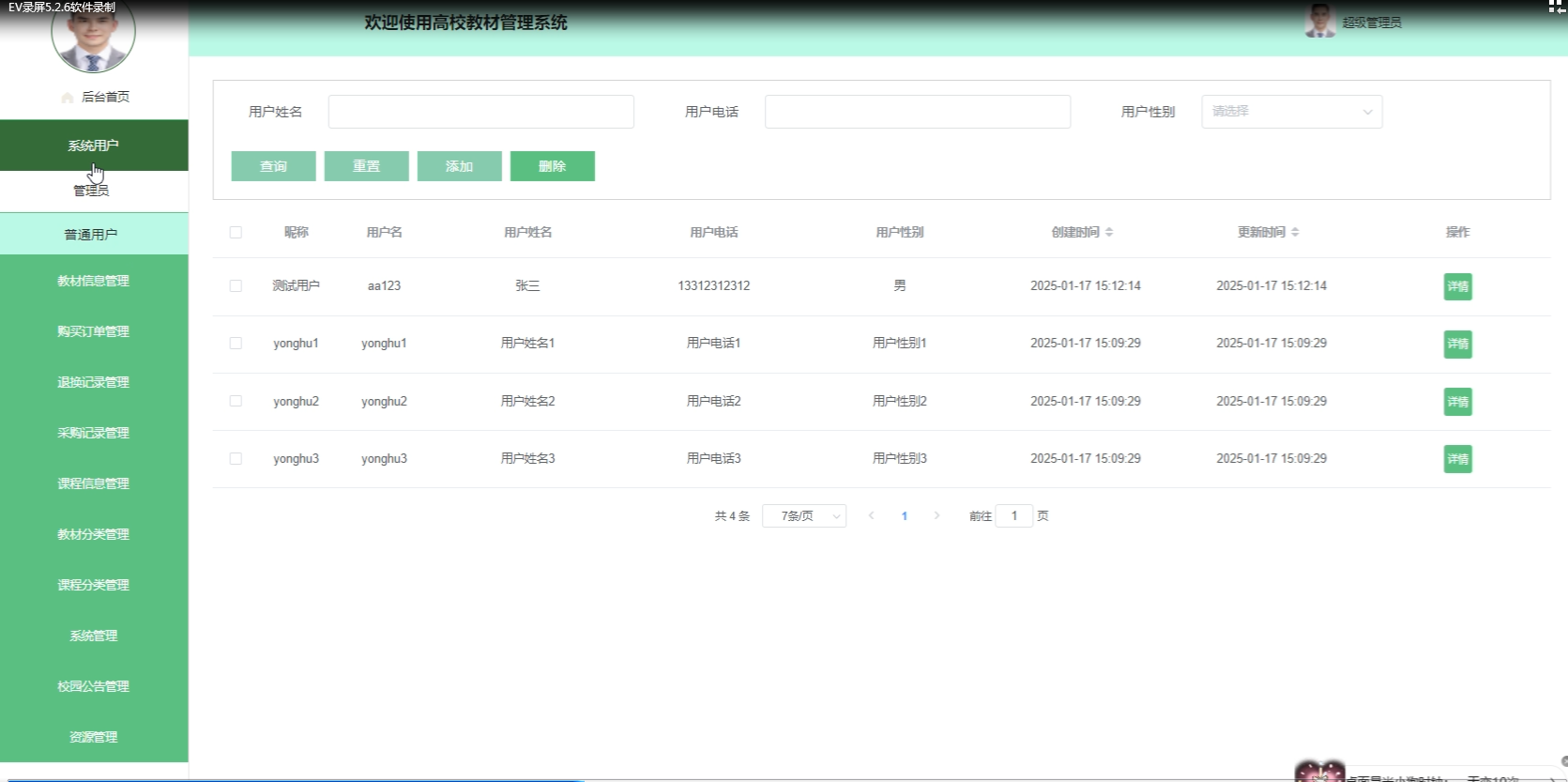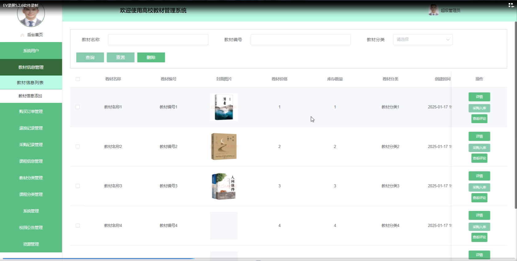 - 教材信息管理:管理员可对教材进行全面管理,包括教材的添加(新增教材的相关信息,如书名、价格、出版社、出版年份等)、修改教材信息、删除不再使用的教材记录等,确保教材信息的完整性和准确性。