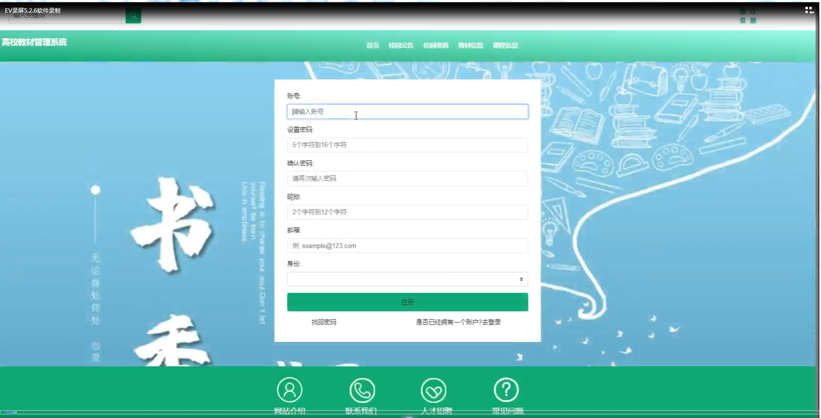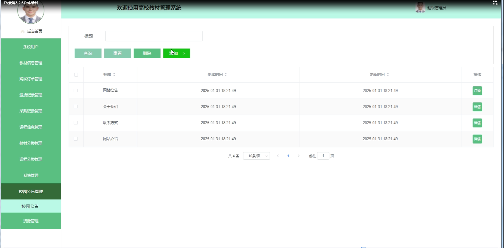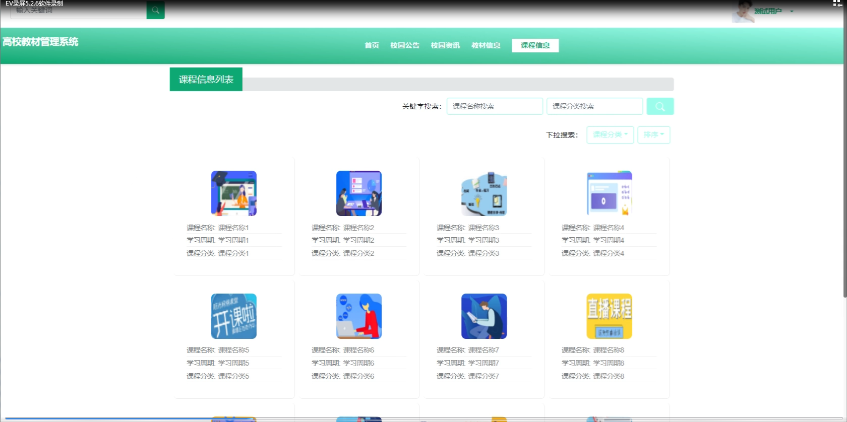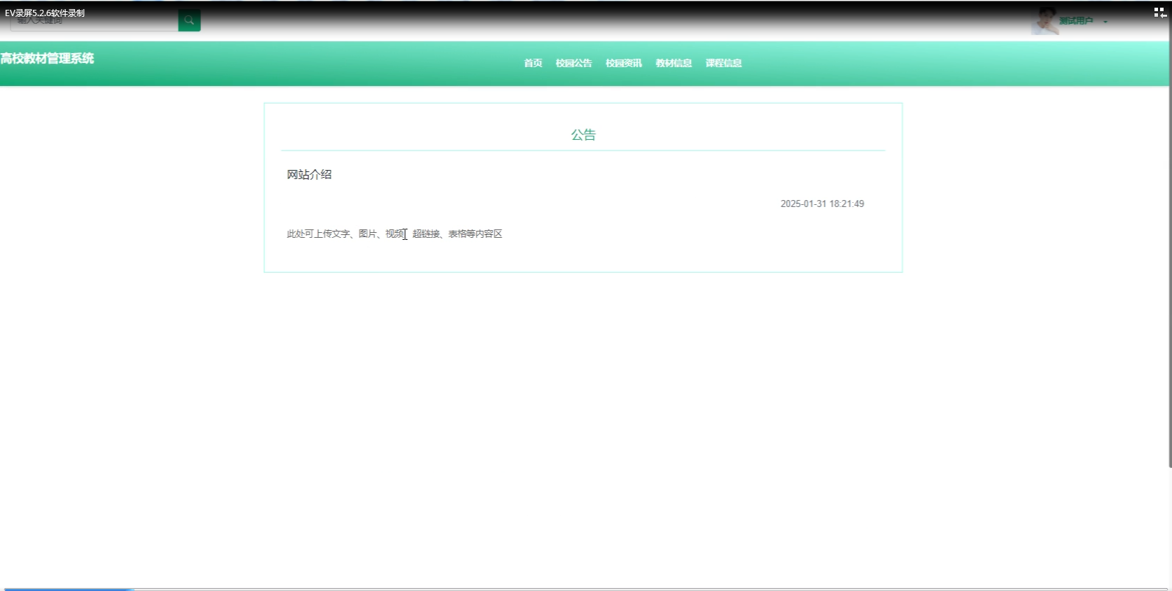 - 首页: 用户可以查看校园公告、校园资讯、教材信息、课程信息、网站介绍、联系我们、人才招聘、常见问题等获取最新的校园动态和重要信息。
