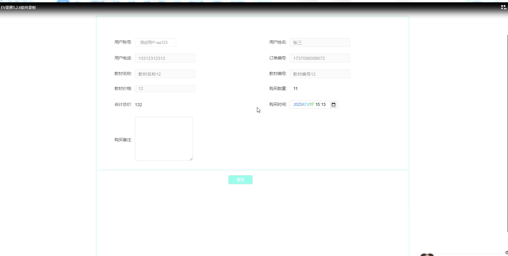 | TC006 | 验证教材信息下单页面跳转 | 1. 进入教材信息详情展示页面 <br> 2. 点击教材信息下单按钮 | 能够跳转至相应教材信息下单页面 | 成功跳转至教材信息下单页面 | 通过 |