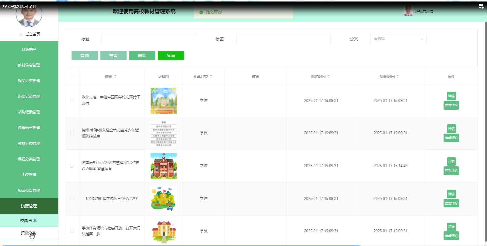 - 资源管理:管理员可以在此对校园资讯、资讯分类进行添加、查询、重置、删除等相关操作,如校内各类学习资源,包括资源的上传(如文档、视频等学习资料)等。