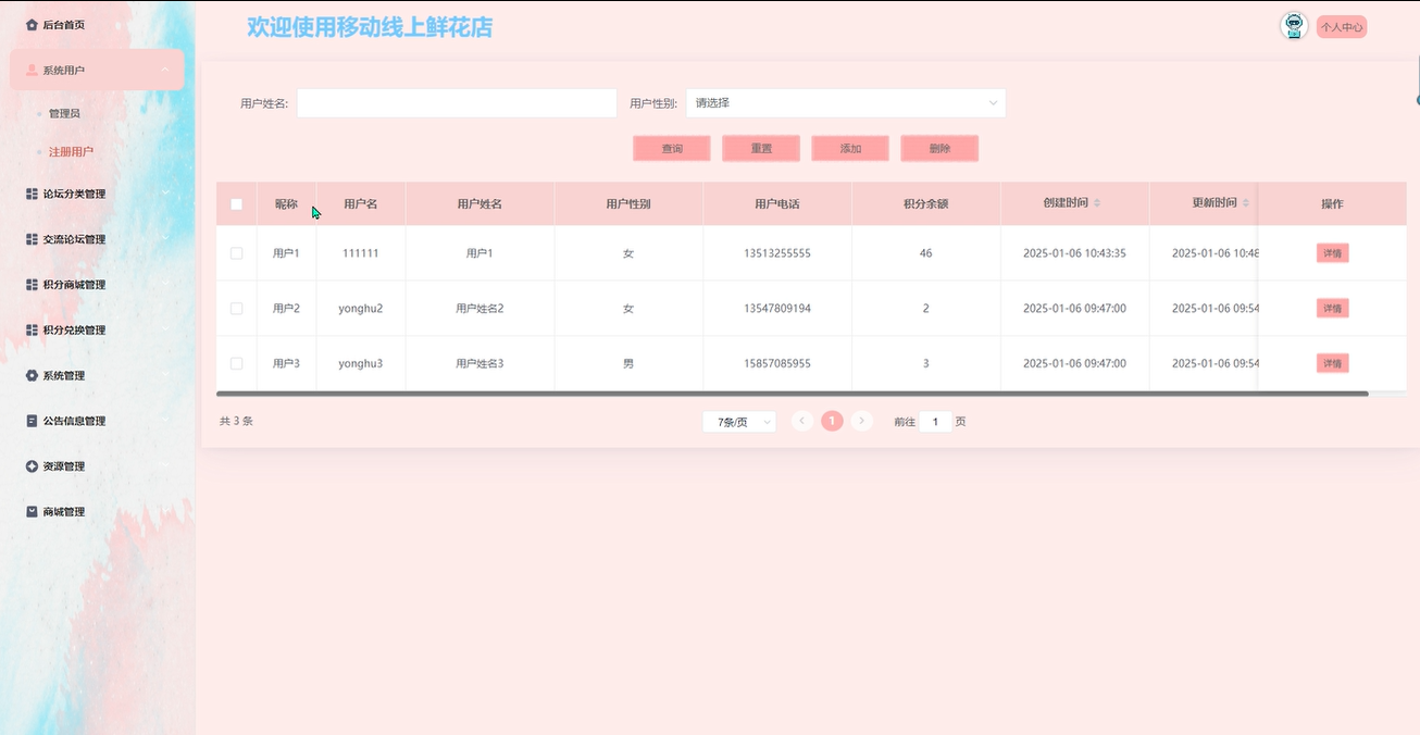 系统用户:管理员可以管理用户账号,通过输入用户姓名、选择用户性别进行搜索,进行增删改查等操作,并管理用户积分。